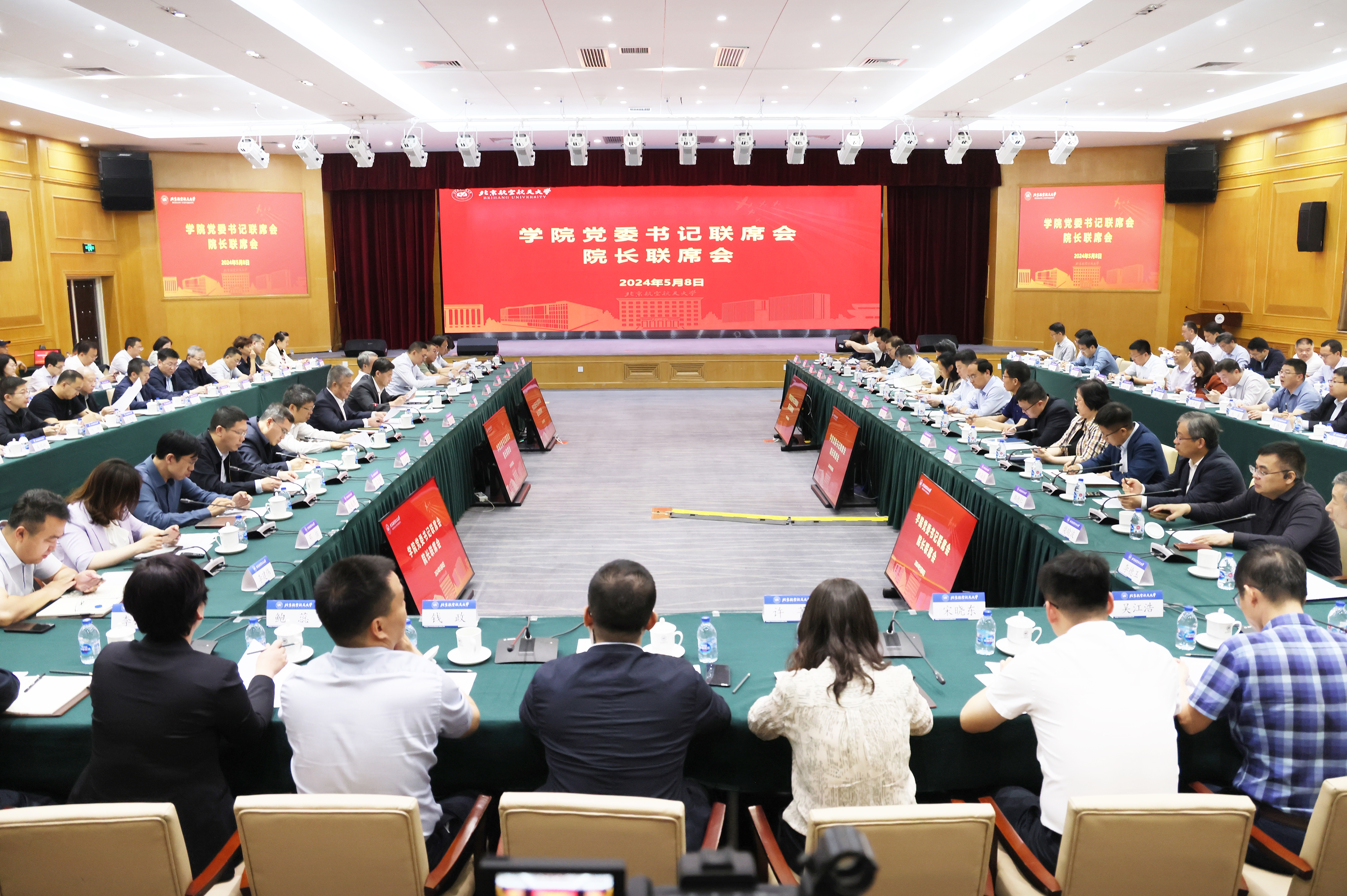 北航新闻网5月9日电(记者 王晴/文 邸白鹭/摄影)5月8日下午,学校在学院路校区如心会议中心召开学院党委书记联席会、院长联席会,总结全校人才培养大讨论成果,与32家二级单位签署校院两级管理体制改革目标任务书。党委书记赵长禄、校长王云鹏,全体校领导,党政机关、服务支撑机构负责人,各学院党委书记、院长参加会议。会议由赵长禄主持。