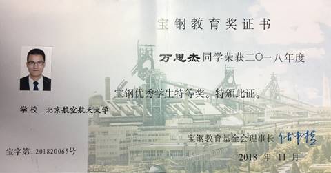 学院博士研究生万思杰荣获2018年度宝钢优秀学生特等奖
