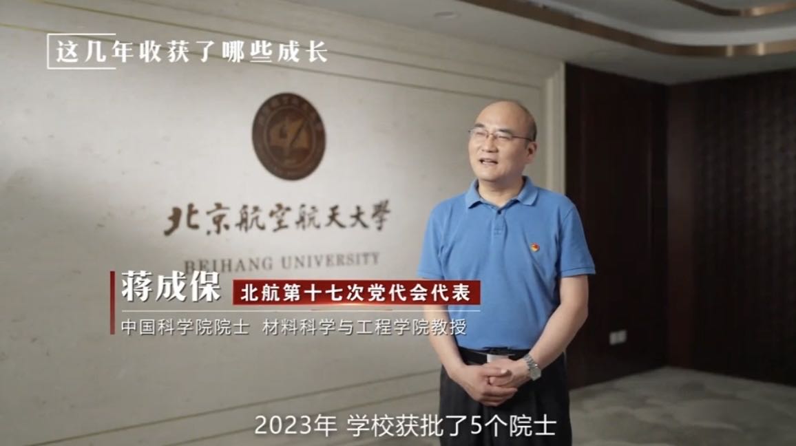 北航第十七次党代会代表 中国科学院院士 材料科学与工程学院教授 蒋成保:这几年学校好事连连,汇聚了一大批人才,特别是2023年,学校获批了5个院士。学校的人才培养也结出了丰硕的果实,获得了一批重要的国家教学成果奖。去年学校凝练学科方向,既有基础研究,也有国家重大需求、学科交叉,那么这是一个很重大的事。