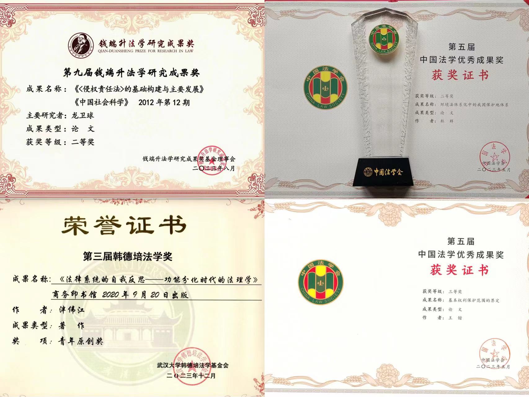 2023年,龙卫球教授荣获第九届钱端升法学研究成果奖;2024年,泮伟江教授荣获教育部第九届高等学校科学研究优秀成果奖(三等奖);2023年,杜群教授、王锴教授荣获第五届中国法学优秀成果奖;2023年,泮伟江教授荣获第三届韩德培法学奖。近8年来,法学院围绕国家重大需求和学科前沿,开展高水平研究,获批国家社科基金重大项目4项,深度参与生态环境法典编纂、《民事诉讼法》修改、《保险法》修改、《企业破产法》修改等国家重要法律法规的立法论证工作,深度参与全国人大的备案审查工作。