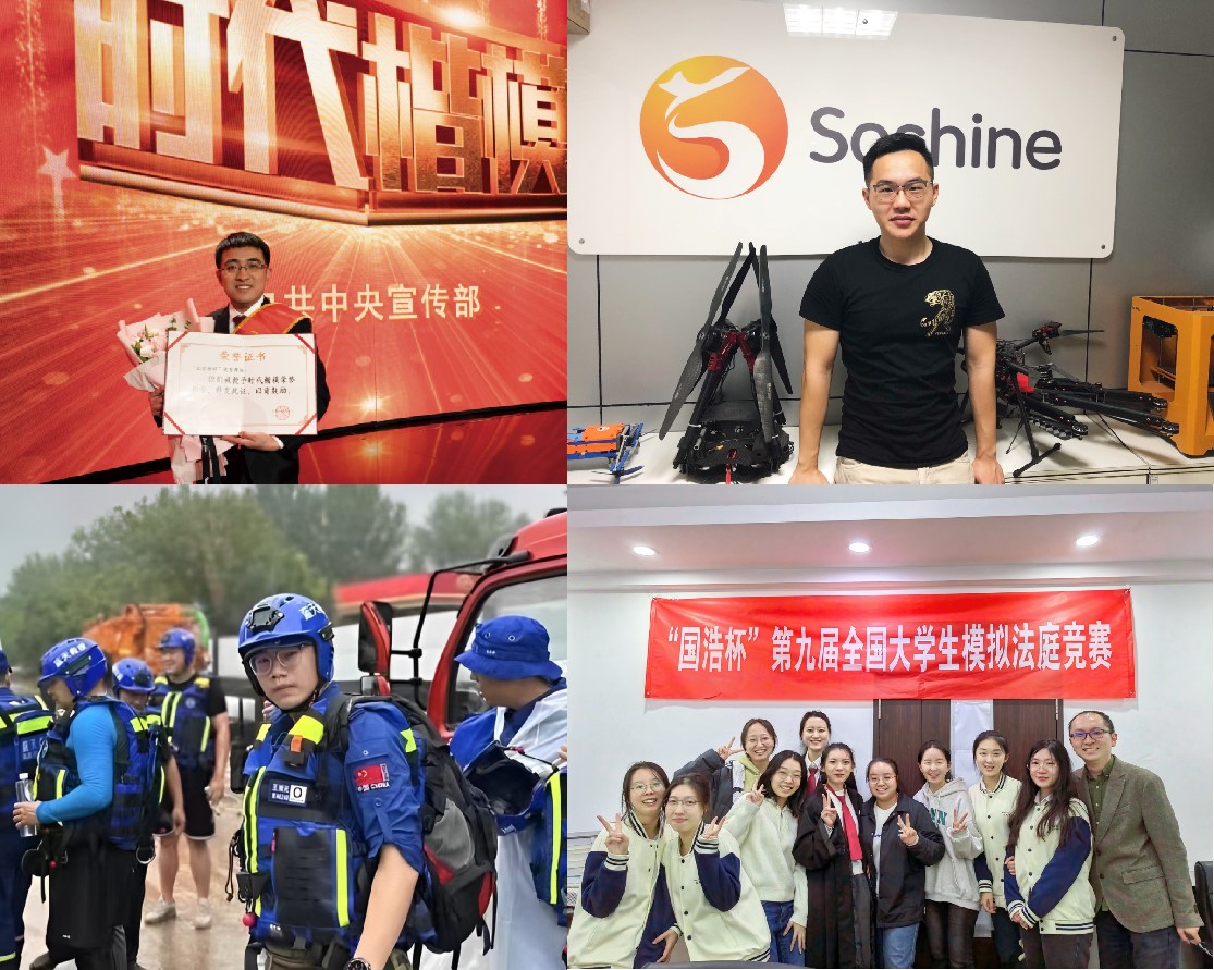 2019年毕业生许泽玮荣获中宣部“时代楷模”称号;2022年毕业生邰鑫来荣获全国“互联网 ”大赛金奖;2023年王桢元在北京7.31特大暴雨中挺膺担当,救助群众80余人,荣获“全国大学生年度人物”称号;2022年模拟法庭赛队成功卫冕全国大学生模拟法庭竞赛一等奖(从上到下、从左至右)