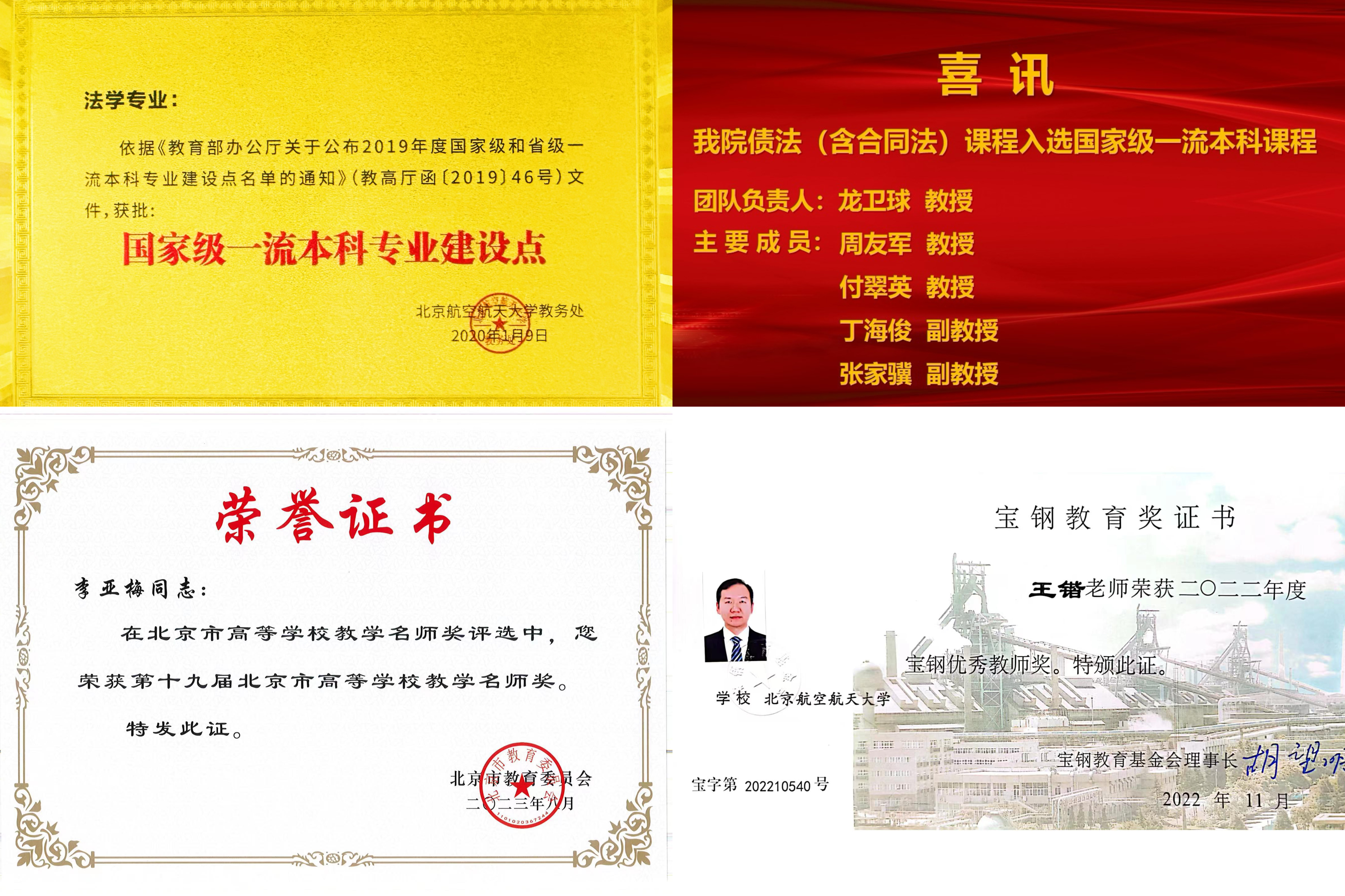 2019年,法学专业入选国家首批一流本科专业建设点;2023年,龙卫球教授团队主讲的债法课程入选国家级一流本科课程;2023年,李亚梅教授荣获北京市高等学校教学名师奖;2022年,王锴教授荣获宝钢优秀教师奖