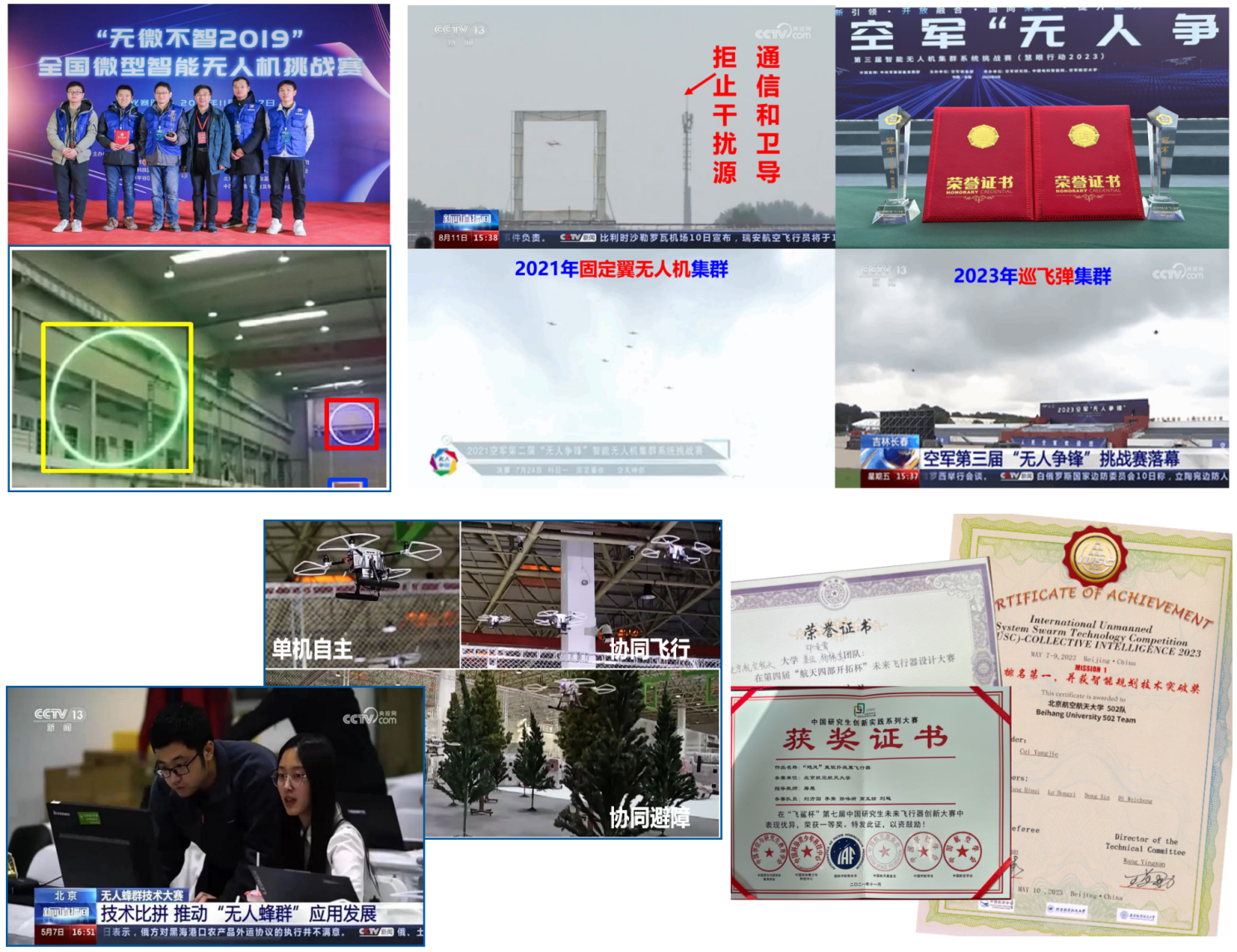 无人系统研究院依托国家科研任务培养人才,发挥科研优势、推动转化为人才培养优势,激发了学生的创造力和实践能力,为他们提供了展示才华和实现自我价值的平台。近年来,研究院教师带领学生参加全国科研比赛方面取得了突出的成绩,包括2019年获得自主精准穿越项目一等奖,2021-2023年参加空军无人争锋比赛,获得密集编队穿越竞速科目三连冠,2023年获得iusc国际无人蜂群技术大赛冠军、中国研究生未来飞行器创新大赛一等奖等。