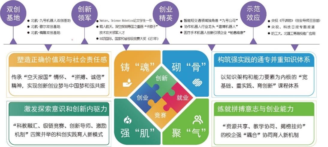 学院加强双创人才培养过程的全方位规划,打造以“科教融通育创新、级链竞赛蓄动力,校企耦合赋能力”为特色的双创人才培养体系。全方位规划双创人才培养体系,历时8年在机械工程及相关专业进行实践检验,分四阶段实现双创人才的进阶成长:铸“魂”,塑造正确价值观与社会责任感;砌“骨”,构筑强实践的通专并重知识体系;强“肌”,激发探索意识和创新内驱力;聚“气”,练就拼搏意志与创业能力。打造出以专业教学、科研实践、产业协同为支撑,“空天报国”情怀为底色的双创育人生态,激发了本科生创新创业内生动力,有关成果获得2022年度国家教学成果二等奖。2024年学院获评北航首批高水平学生科技创新团队(北航机器人队),近年来,在“挑战杯”“互联网 ”等系列大赛中累计获得省部级及以上奖项50余项。科创成果成为了学生的创业之本,孵化出的“九号公司”成为智能短交通领域独角兽企业,并于2020年成功上市。
