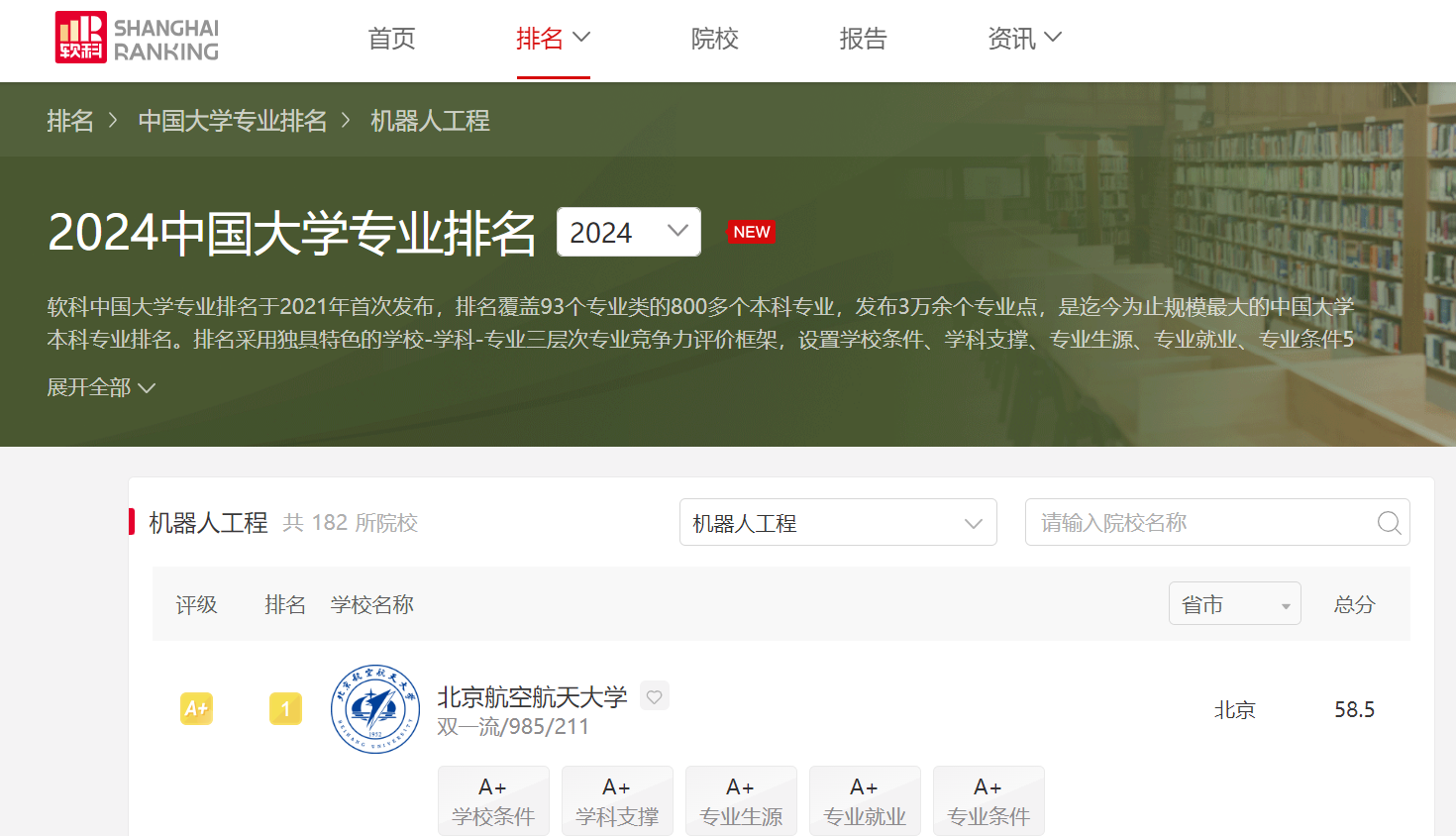 机器人工程专业在2024年软科排名第一