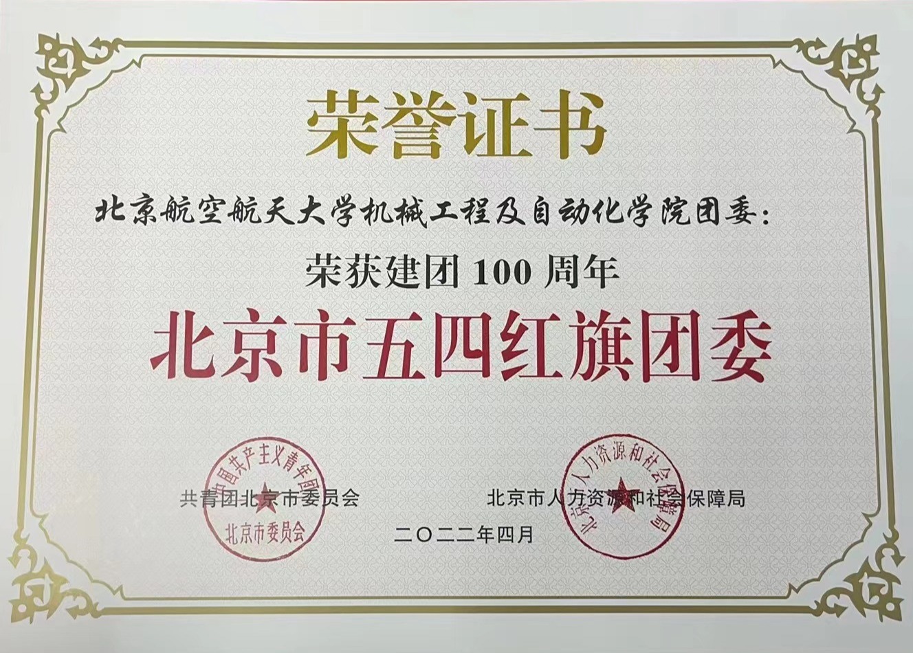 学院团委2022年获评建团100周年“北京市五四红旗团委”