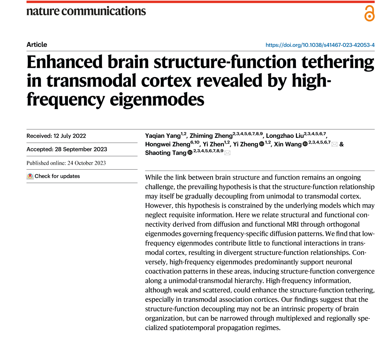 智能基础团队围绕中国脑计划与新一代人工智能发展规划,重点研究大脑复杂交互行为的底层机制与结构基础,创新性地引入异质耦合分析视角,打破以往认知,首次发现了基于低频特征模的单模态-跨模态的结构-功能解耦和基于高频特征模的逆解耦现象,为人类大脑高级功能相关区域的交互机制带来了新的可能,推动对大脑功能涌现机理及其结构基础的多层次理解。研究成果2023年10月发表于《nature communications》。