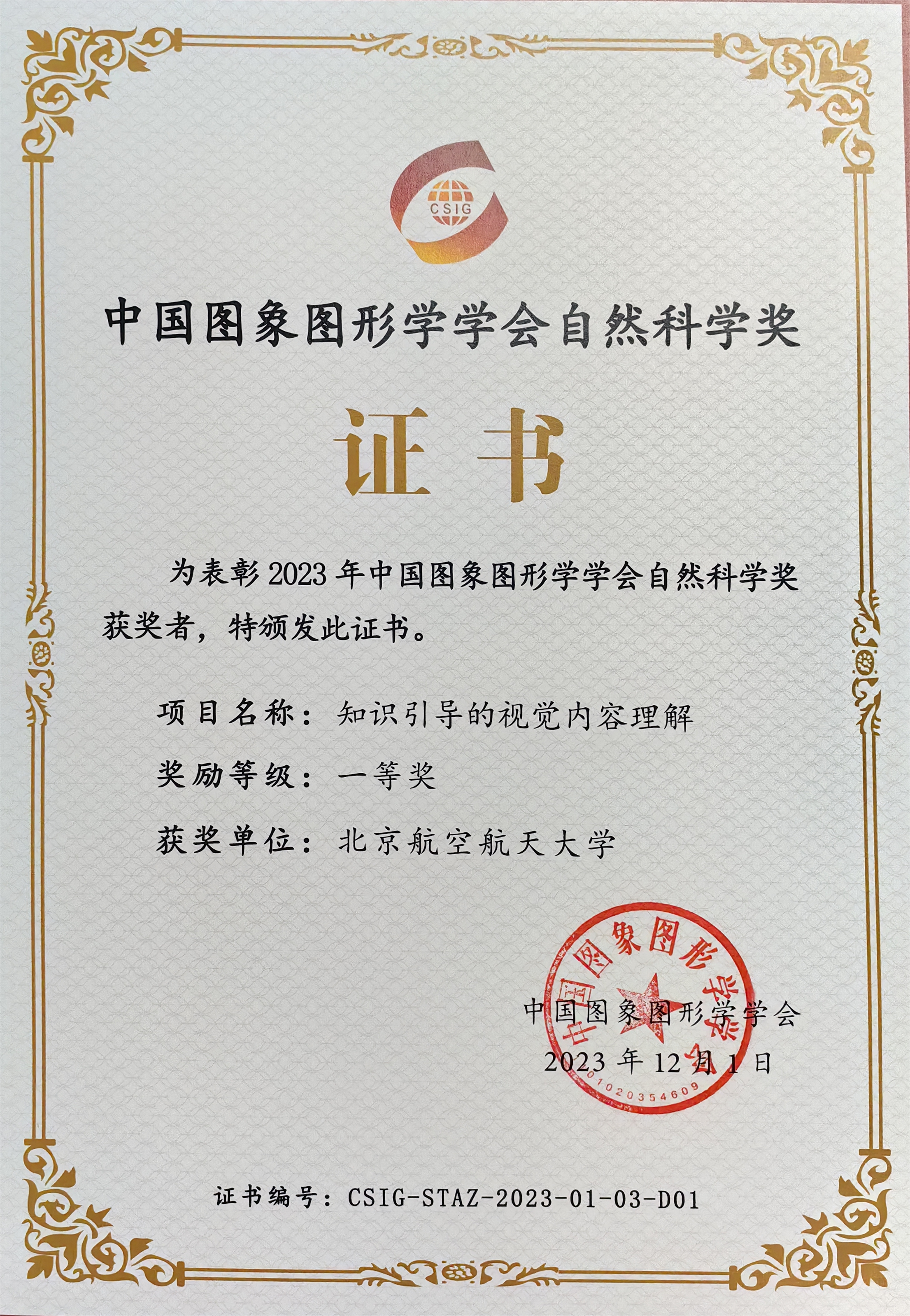 成果获2023年度中国图象图形学学会自然科学奖一等奖