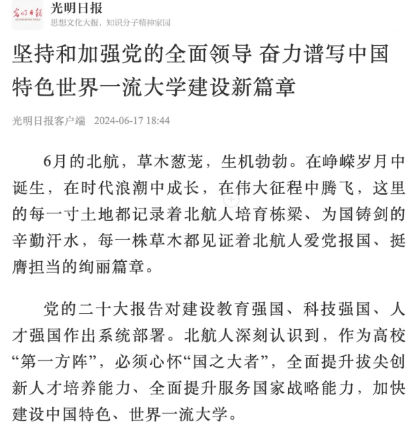 2024年6月17日,光明日报客户端以《坚持和加强党的全面领导 奋力谱写中国特色世界一流大学建设新篇章》为题,报道北航高质量内涵式发展成果。