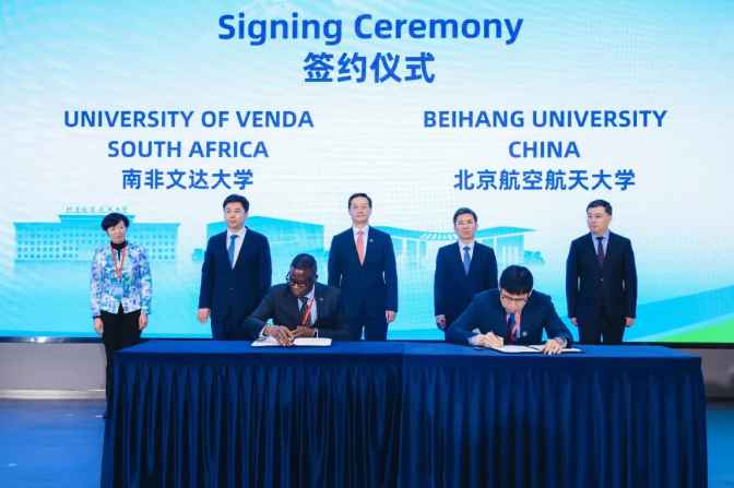 南非文达大学校长ndanduleni bernard nthambeleni、赵巍胜代表双方共同签署《北京航空航天大学与南非文达大学合作备忘录》。根据协议,两校将在建立联合实验室、加强师生互访交流、联合举办学术会议、合作发表论文等领域加强合作。