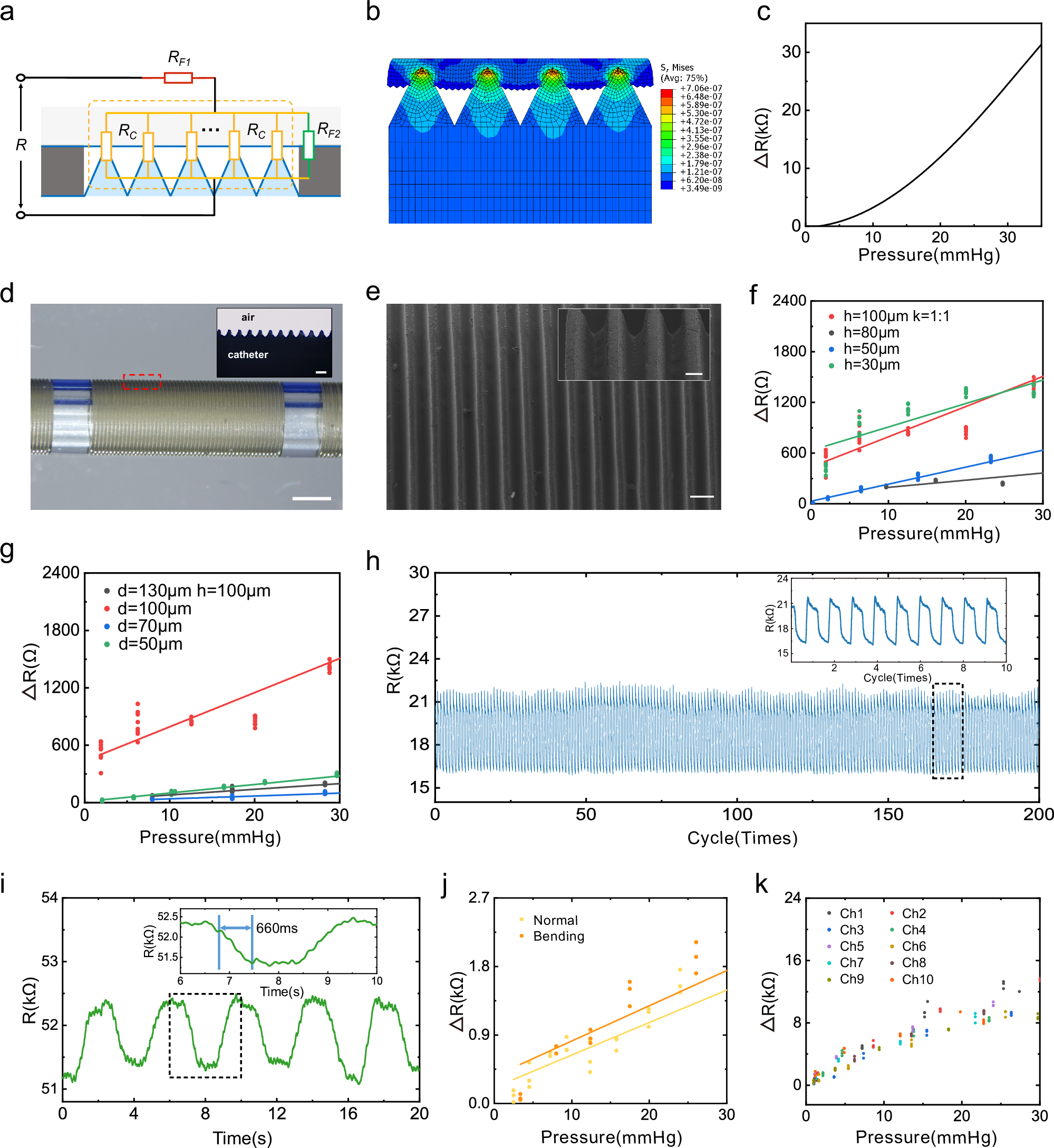 本传感器阵列采用了先进的3d飞秒激光制造工艺,可直接在医用导管上雕刻形成功能性微结构,实现压力传感功能。同时传感阵列选用pdms作为柔性包覆膜,在包覆膜层和导管微结构表面涂覆含有pedot:pss、pva和eg的导电混合物构建形成压阻式传感器,具有空间分辨率高、稳定性好、灵敏度高(38.1 ω/mmhg)、响应时间快(660ms)等特点(图2)。