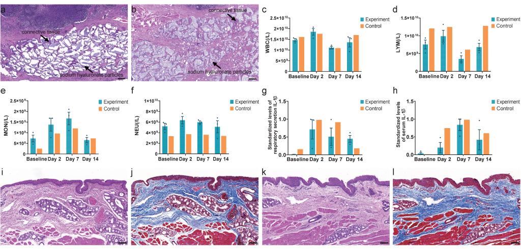 该研究通过组织病理学检查和血清对比分析评估了osahs模型猪的系统和局部炎症反应。同时进一步将传感器阵列置于正常猪上呼吸道内24小时,组织病理学检查显示与空白组相比无异常炎症或组织异常。各项结果证实该传感器阵列具有良好的生物相容性(图4)。
