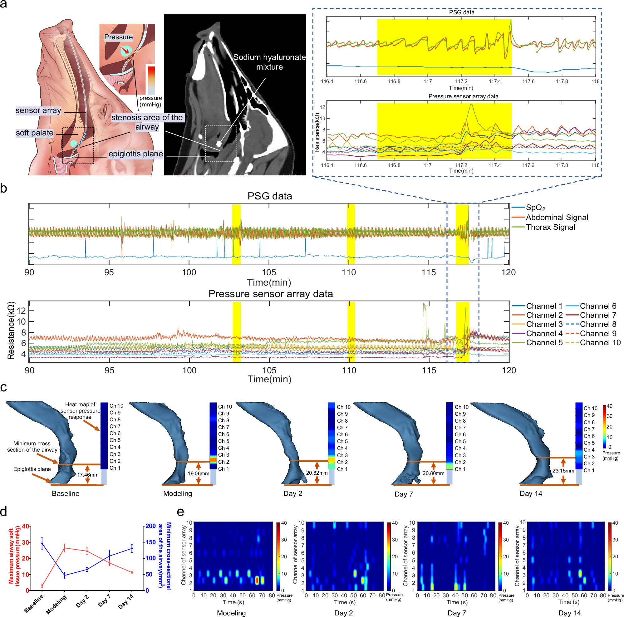 图3.导管式柔性压力传感器阵列在osahs模型猪中的体内验证。