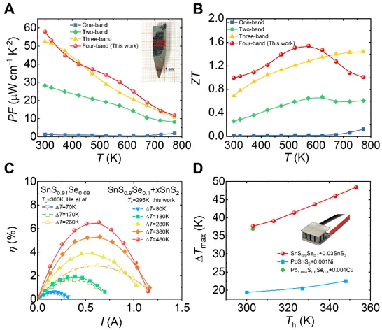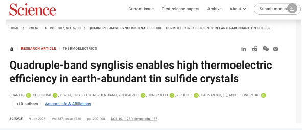北航新闻网1月10日电(航宣)2025年1月10日,国际顶级期刊《science》报道了北航赵立东课题组在高储量、低成本、宽带隙热电材料及器件研究领域取得的最新进展:《quadruple-band synglisis enables high thermoelectric efficiency in earth-abundant tin sulfide crystals》,该工作在硫化锡(sns)晶体中发现和调控了四个价带在能量和动量空间的协同效应(quadruple-band synglisis),在p型sns晶体中实现了~48k的制冷温差及~6.5%的发电效率。通常认为能带间隙在eg≈6-10 kbt(kb为玻尔兹曼常数)范围内的材料为理想的制冷材料(goldsmid, et al. thermoelectric refrigeration,springer, 1964.),该工作表明带隙eg宽达46 kbt的sns也可作为热电制冷材料【science 387 (2025) 202-208】。博士生刘姗为第一作者,卓越师资博士后秦炳超、常诚教授、赵立东教授为通讯作者,北京航空航天大学为第一单位。这是赵立东教授课题组自2015年以来发表的第11篇《science》。
