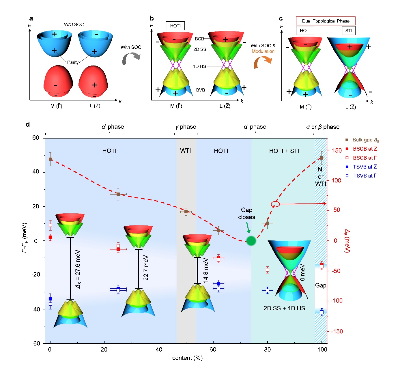 本质上,研究团队利用卤族元素br和i的电负性、原子半径差异,通过引入不同比例的卤族元素调控bi4x4链间、层间的相互作用,最终实现了单层堆垛、双层平行堆垛、双层反平行堆垛、三层混合堆垛等多种堆垛模式。进一步,由于bi4x4单原子层是理想的量子自旋霍尔绝缘体,不同堆垛模式带来了不同的层间耦合方式,以此实现了拓扑边界态的不同种耦合方式,成功设计并实现三维高阶拓扑绝缘体、弱拓扑绝缘体、狄拉克半金属、强拓扑 高阶拓扑共存相、平庸绝缘体等多种拓扑电子态,并构建了它们之间的转化关系与整体拓扑序相图(图d)。该材料体系中的丰富可控拓扑相、复合拓扑相不仅对复杂拓扑电子态的耦合关系提供了平台,更为设计、实现多功能集成化的拓扑电子元器件奠定了坚实基础。