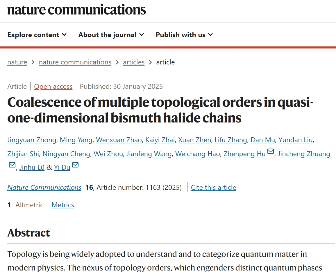 北航新闻网2月9日电(通讯员 冯海凤)近日,北航物理学院表面物理与量子物质研究团队与清华大学、南开大学等合作,在实现多重可控拓扑相变研究方面取得重要进展,相关研究成果于1月30日以“coalescence of multiple topological orders in quasi-one-dimensional bismuth halide chains”为题在线发表于《nature communications》上。物理学院博士生钟景元、杨明为共同第一作者,杜轶教授、庄金呈副教授与南开大学胡振芃教授为共同通讯作者,其他合作者包括湘潭大学刘韵丹副教授、安徽大学程宁燕副教授、常熟理工大学周苇副教授、北航王建峰副教授、郝维昌教授、吕金虎教授等,北航为第一单位。