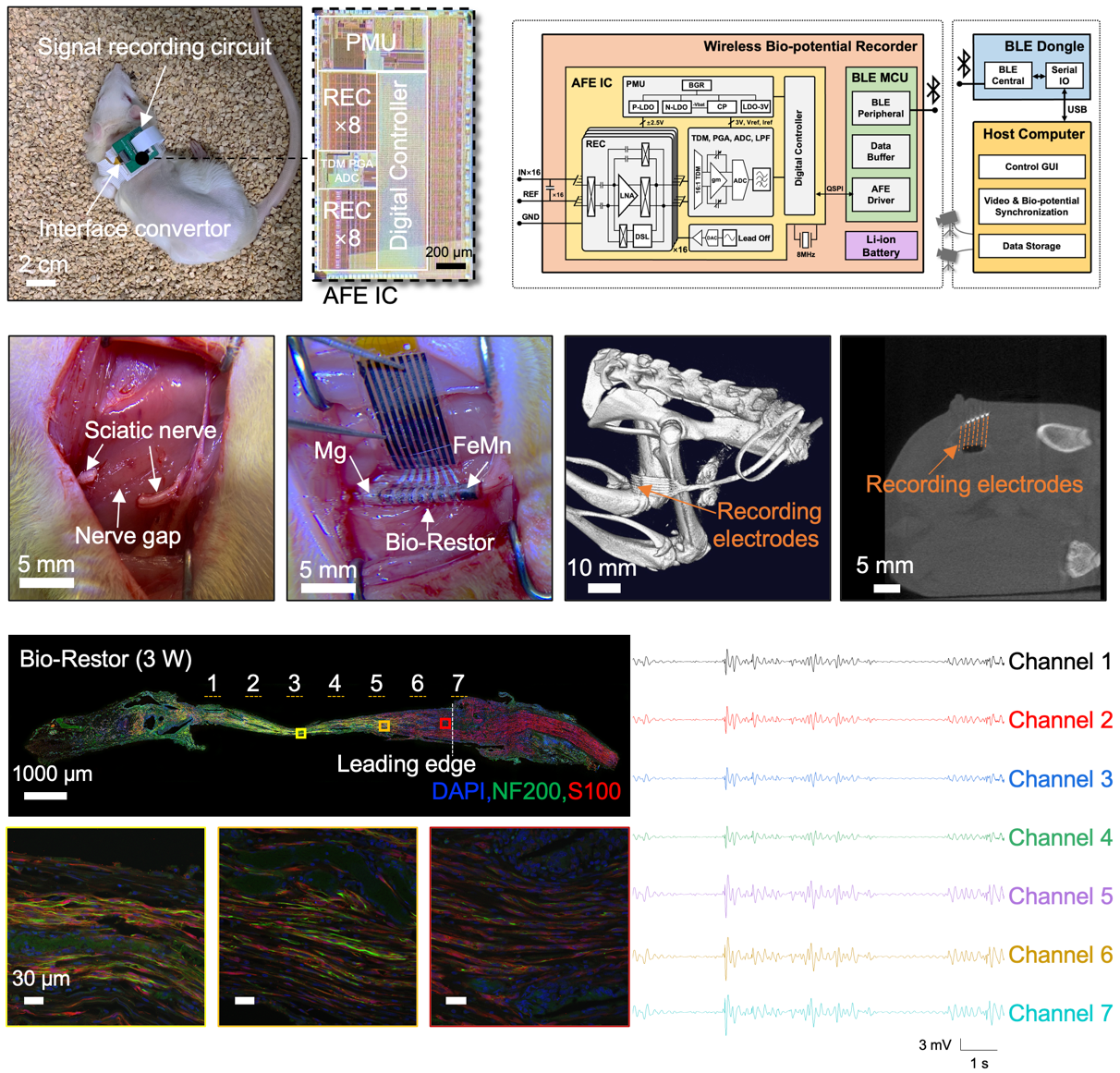 该研究开发了一种集成信号监测功能的可降解电刺激神经接口。实验结果表明,该接口不仅能通过电刺激显著促进大鼠坐骨神经缺损的修复,还可通过无线实时采集神经信号,在体评估神经再生长度,为神经修复过程提供实时监测手段。