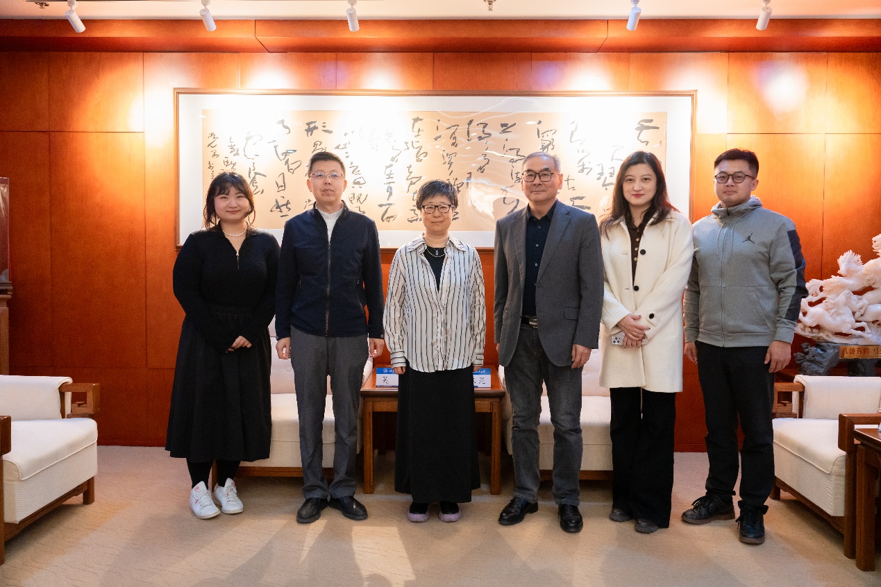 讲座开始前,美育中心主任兼新媒体艺术与设计学院院长沈旭昆、新媒体艺术与设计学院党委书记苗建军等与吴靖亲切交流并赠送北航特色纪念品。
