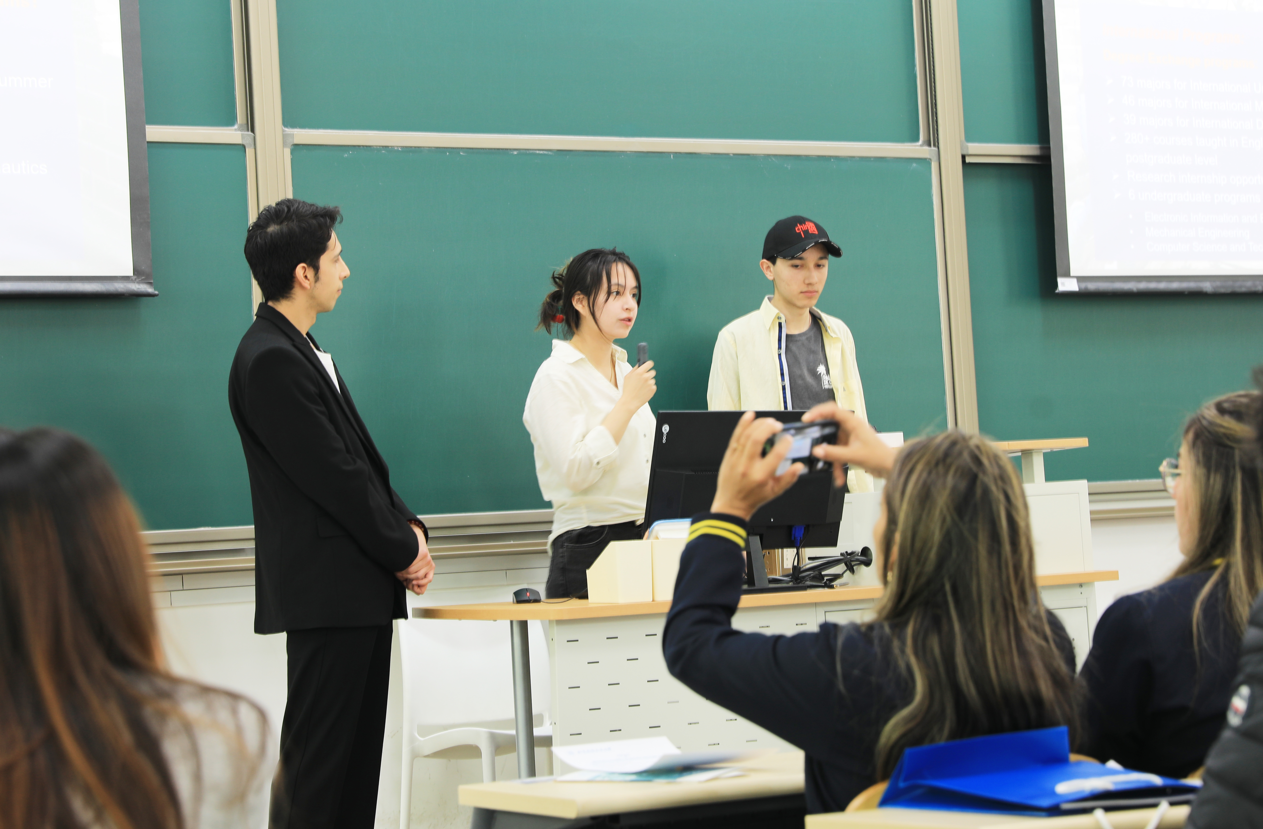 随后,来自哥伦比亚的国际学生茉莉、伽柏立及安越详细介绍了我校国际学生招生项目并分享了在北航的学习生活感受。