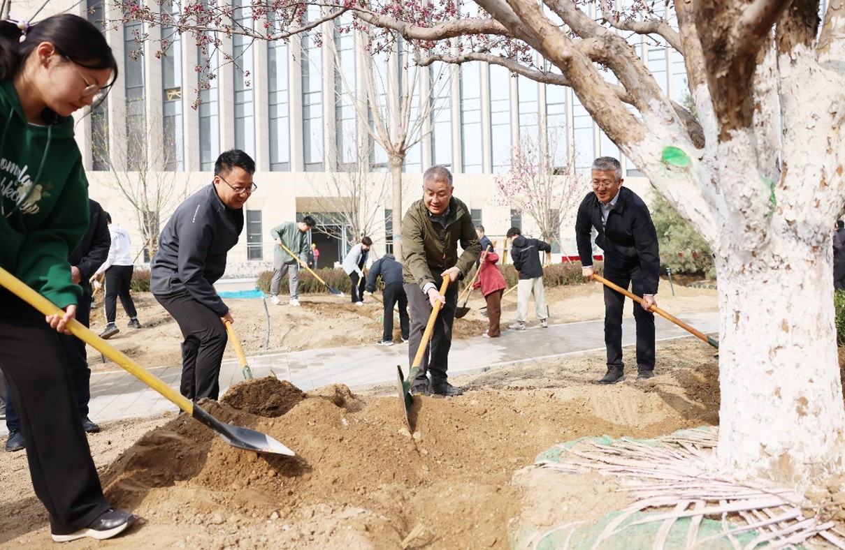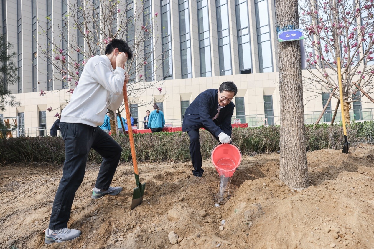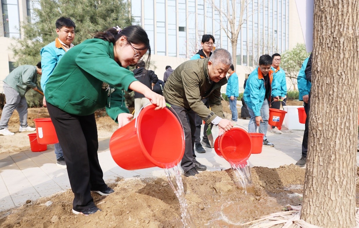 师生同植绿,花香伴馆新。植树现场,校领导与师生代表挥锹培土、扶苗围堰、提水浇灌,合力栽下20余棵优质苗木。新栽苗木错落有致,与周边在建的图书馆相映成景,为沙河校区打造出一道靓丽的生态风景线。