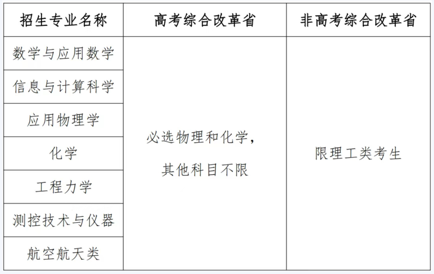 我校围绕数学与应用数学、信息与计算科学、应用物理学、化学、工程力学、测控技术与仪器、航空航天类等专业设置2025年强基计划招生专业及对应培养方向。符合报名条件的考生在各省(区、市)可填报的招生专业和招生计划以我校强基计划报名系统公布为准。
