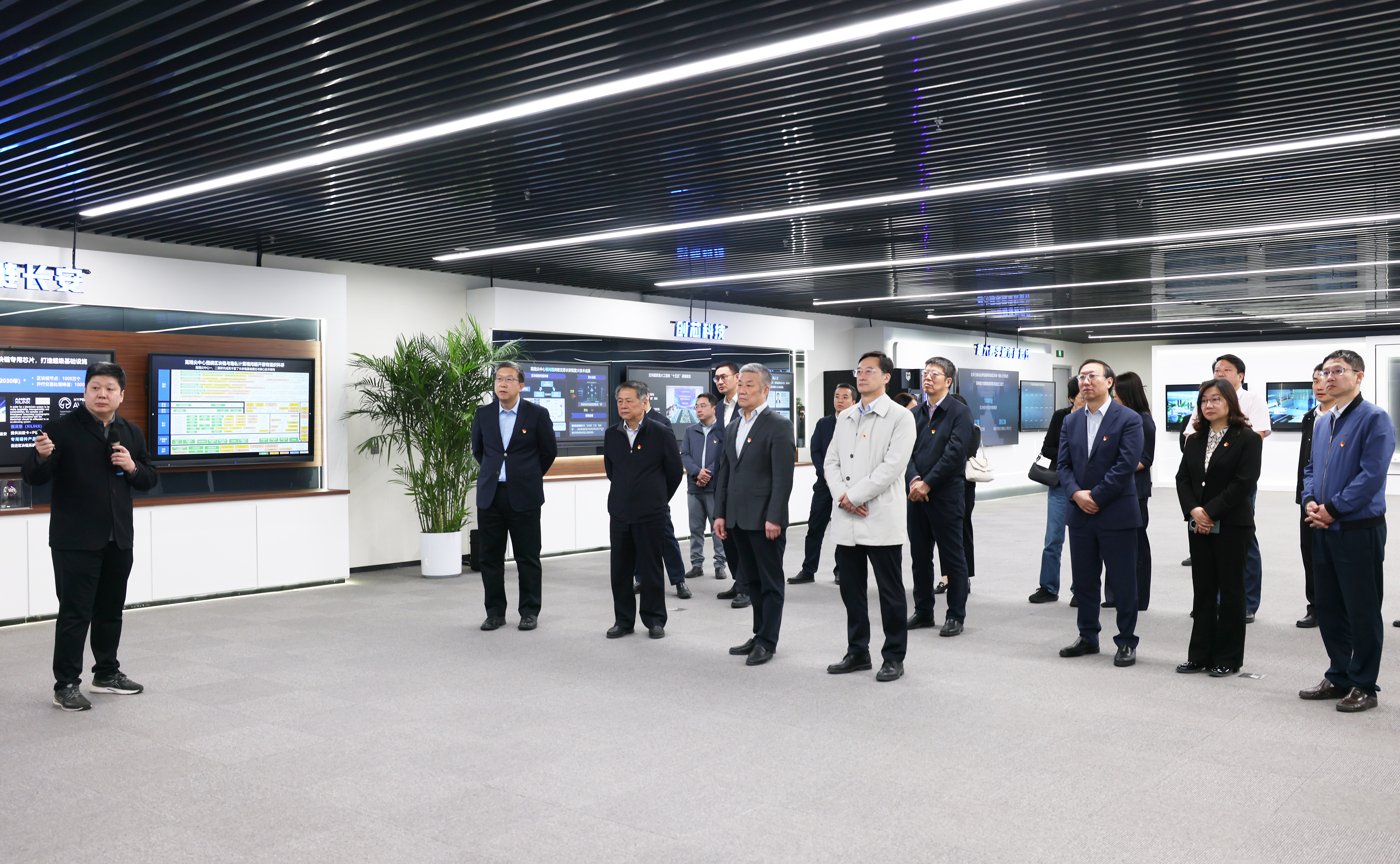 北航新闻网4月25日电(记者 唐鹏飞/文 邸白鹭/摄影)为扎实推进深入贯彻中央八项规定精神学习教育,以担当实干的工作作风推动办学治校数智化转型,赋能学校高质量发展,4月25日上午,校党委理论学习中心组和校领导班子读书班赴北京微芯区块链与边缘计算研究院开展调研学习。