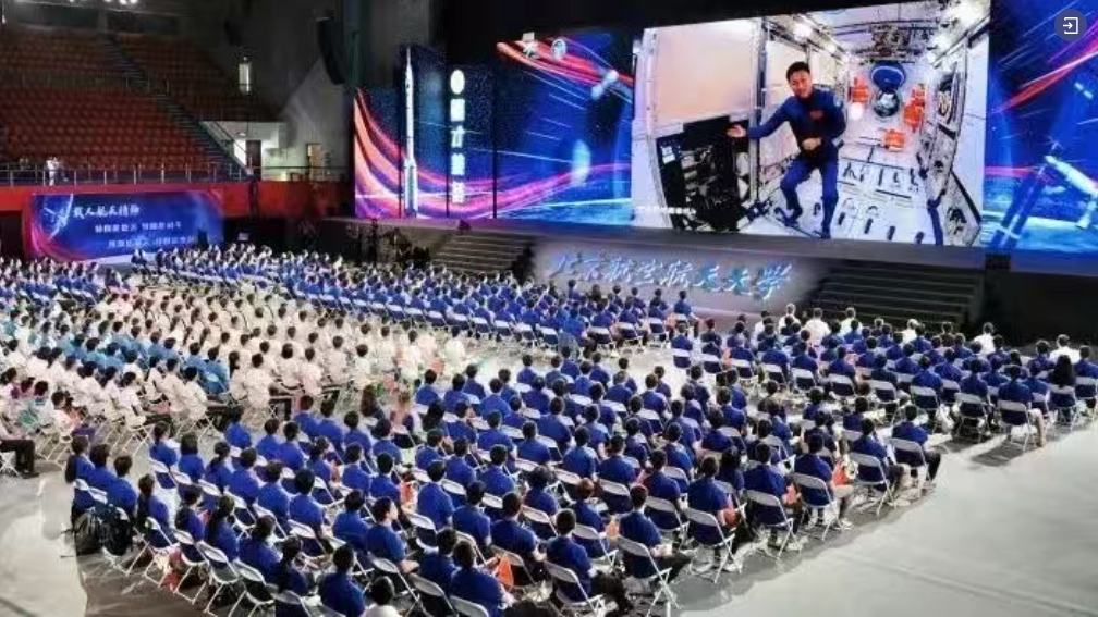 2023年9月21日,“天宫课堂”第四课在中国空间站开讲。位于北航的地面课堂,2000多名北航学子共同聆听,并现场同太空中的桂海潮互动交流