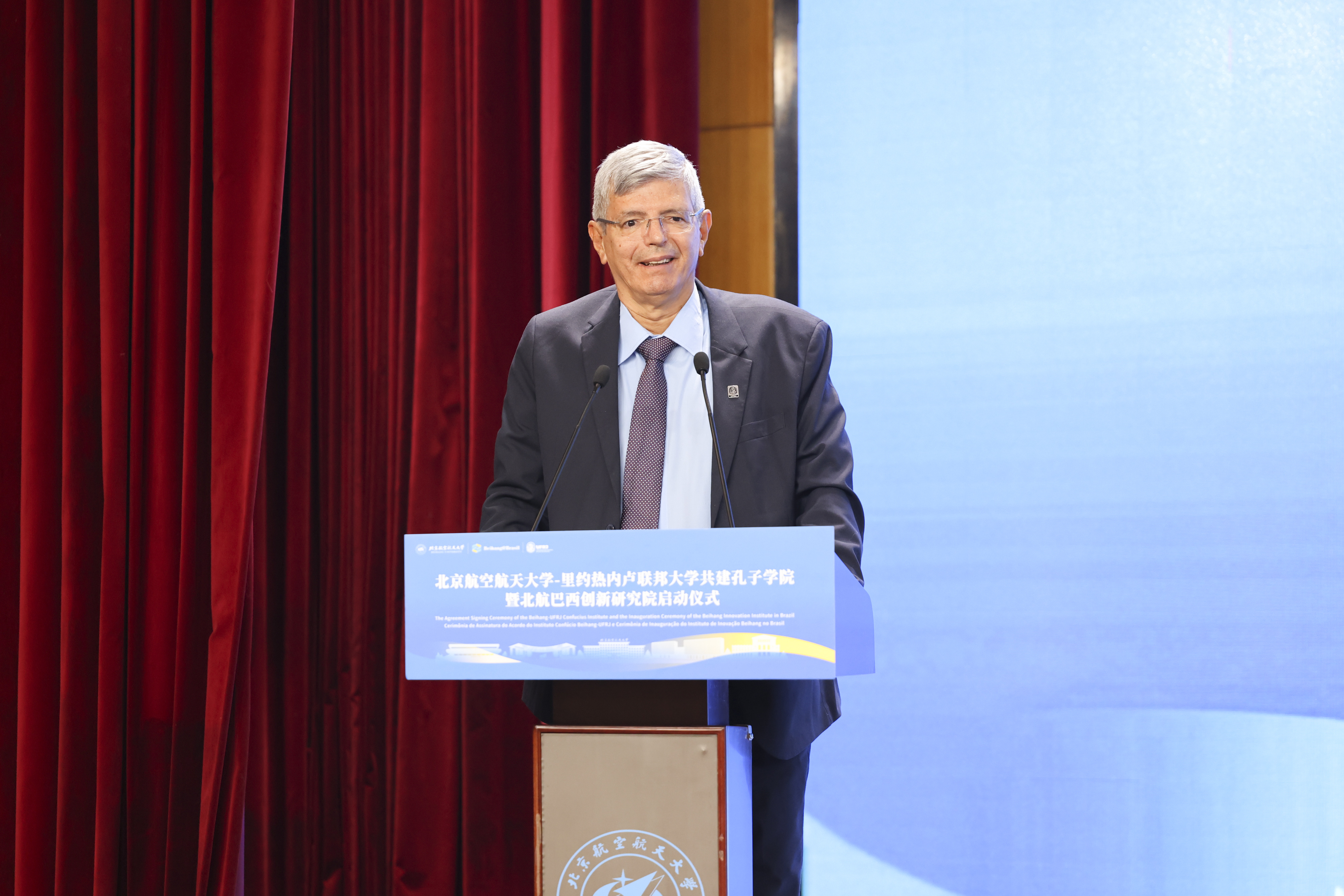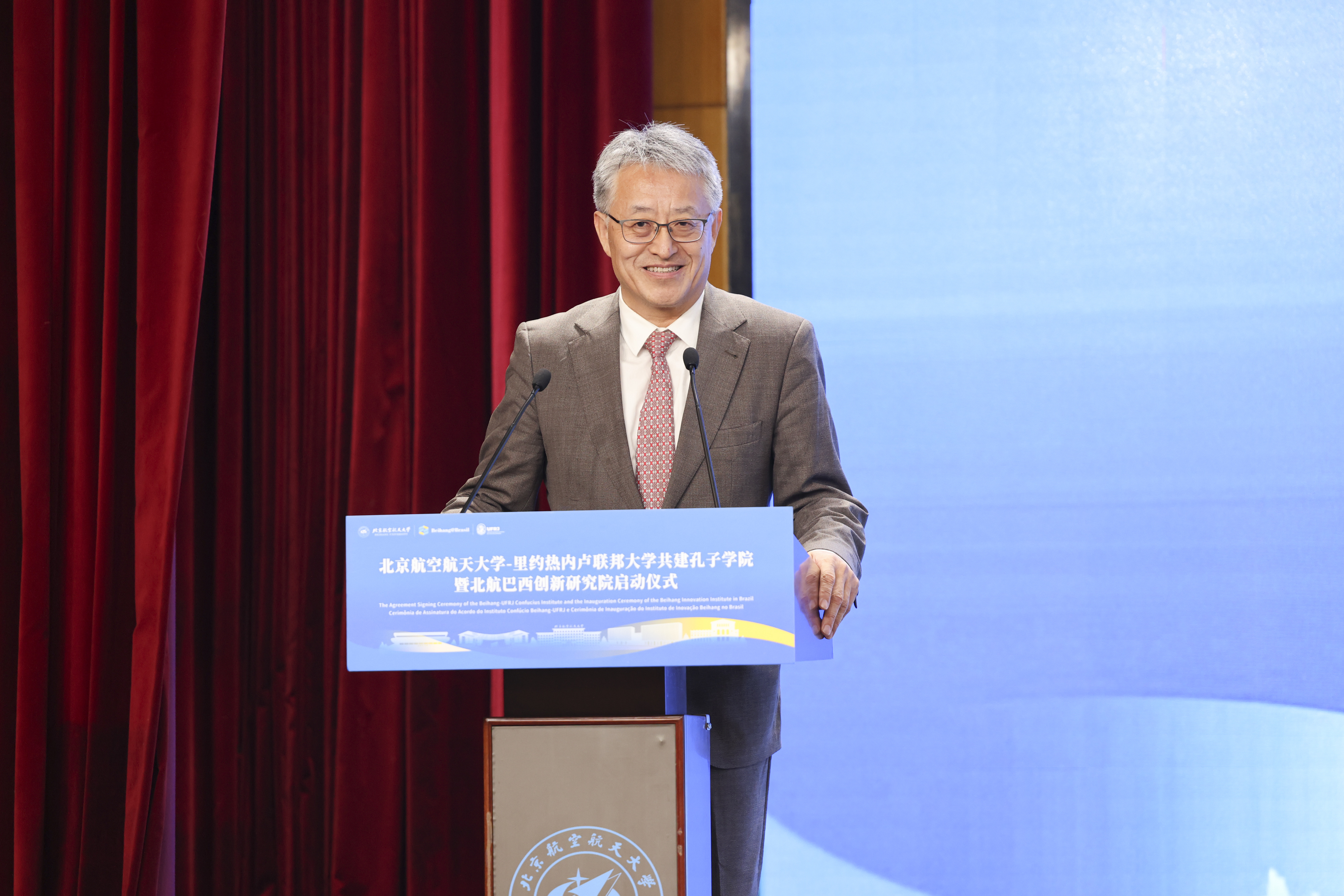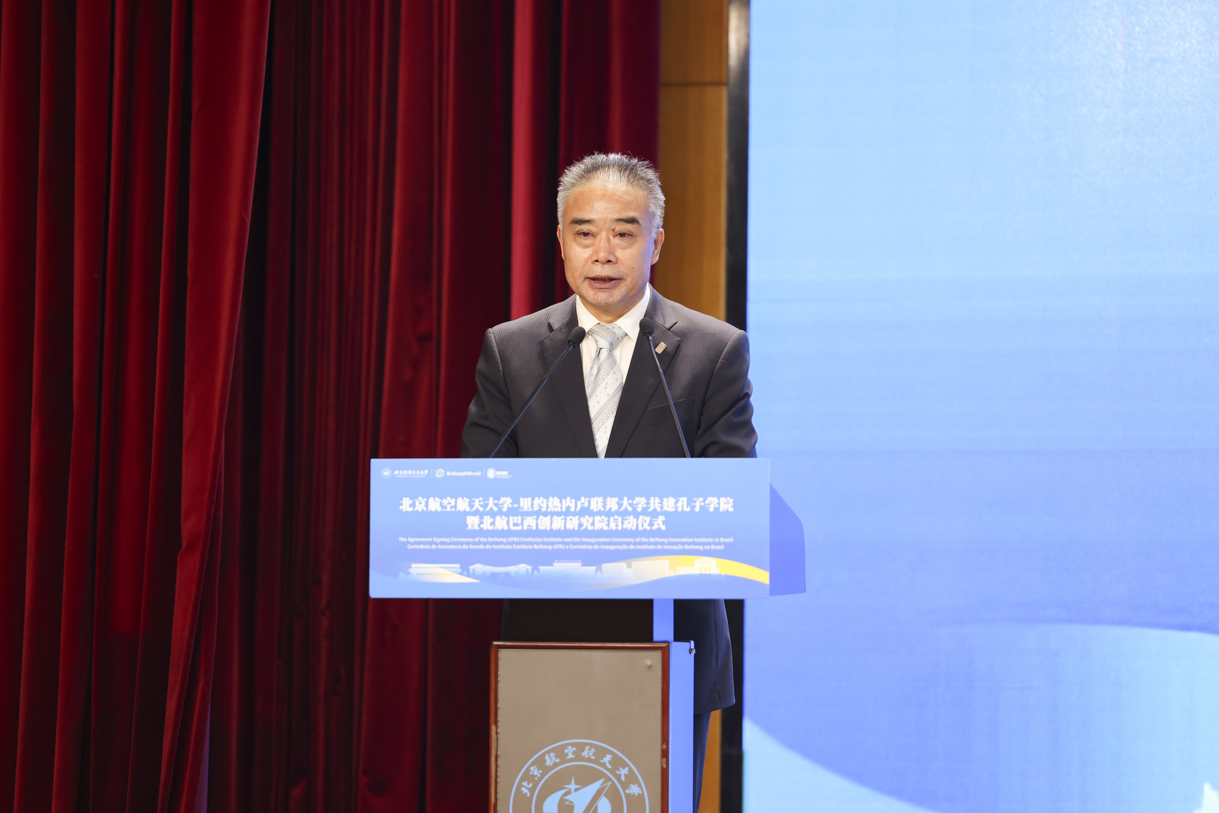 赵灵山在讲话中衷心祝贺北航与里约热内卢联邦大学共建孔子学院及北航创新研究院的成立。他表示,这是中巴50年教育交流合作的结晶,也是中巴深化全方位战略合作定位的鲜明体现,必将促进两校在教育、科技、文化等领域的深度合作,续写中巴两国人民友谊的新篇章。