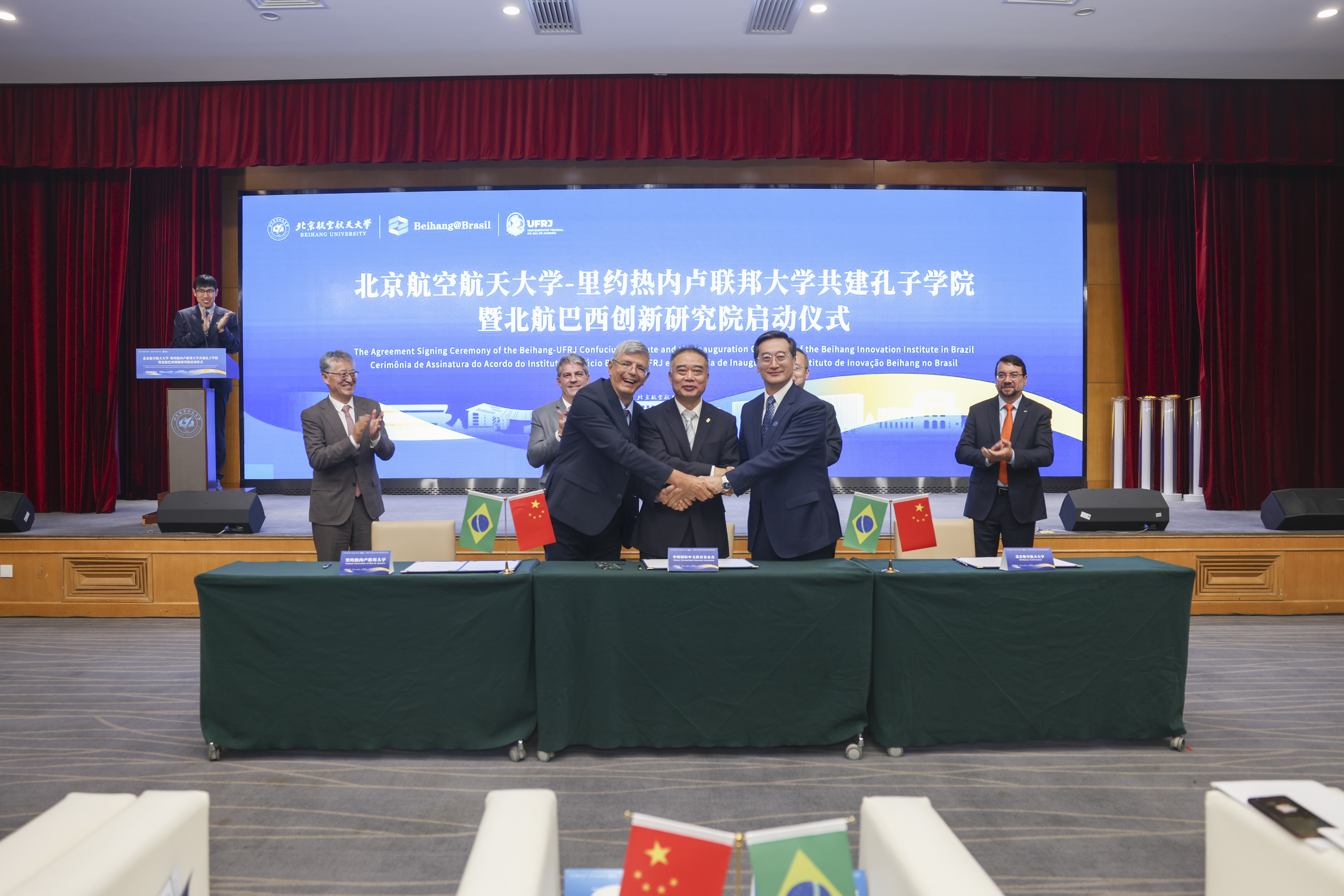 在全体嘉宾见证下,王云鹏、罗伯托·梅德罗尼奥、赵灵山共同签署孔子学院合作协议。根据协议,北航与巴西里约热内卢联邦大学在巴西共建孔子学院,发挥北航航空航天学科优势,推进“中文 航空航天”建设,联合开展汉语教学、文化交流、科研合作及人才培养。