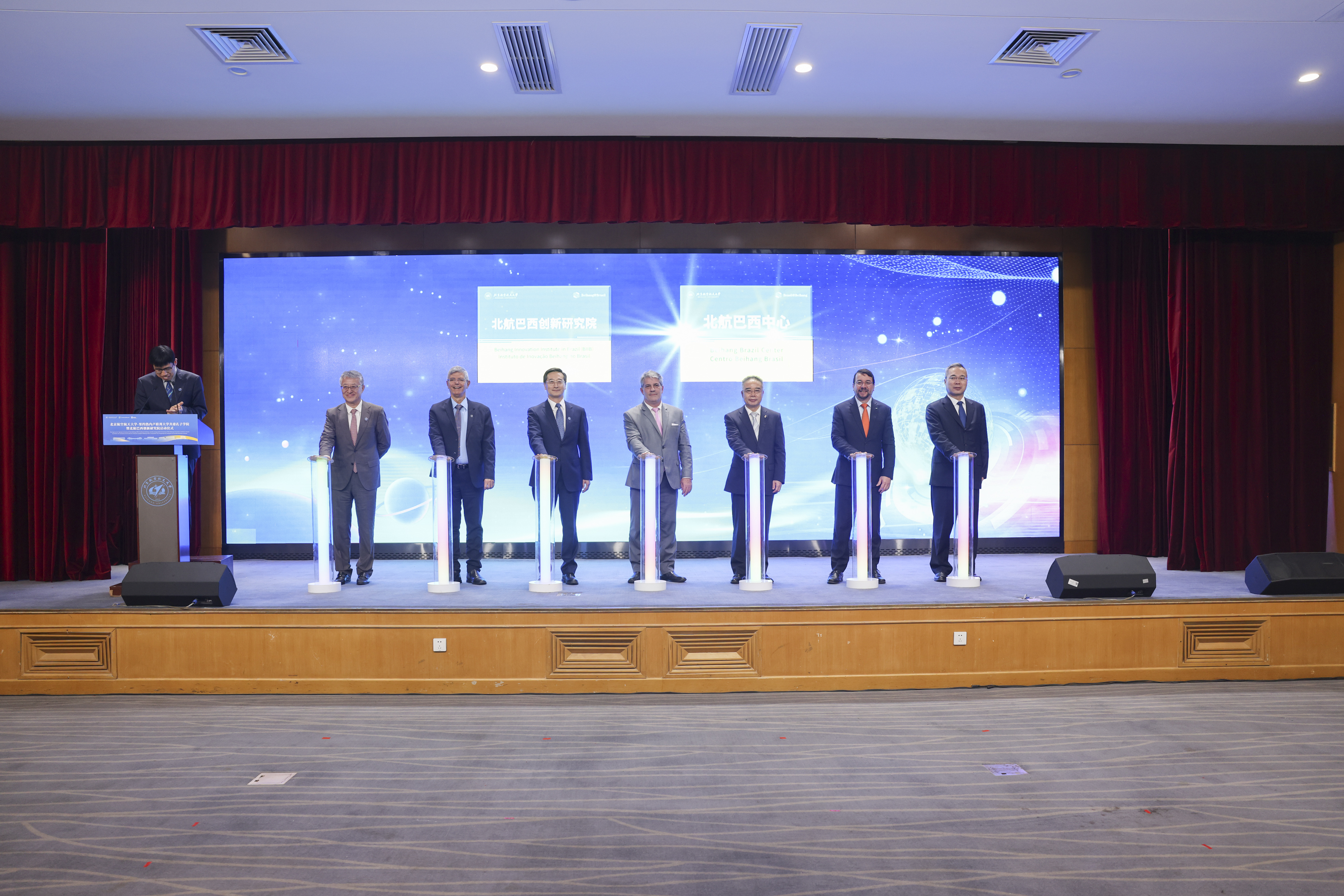 王云鹏、马塞洛·布雷加尼奥利、罗伯托·梅德罗尼奥、里卡多·特林达德、赵灵山、王志伟、庾志成,七人共同为北航巴西创新研究院和北航巴西中心揭牌。依托孔子学院,北航在巴西建立北航巴西创新研究院,在北航杭州国际校园建设北航巴西中心,通过加强互访与交流,双方将共同推动教育、科技、文化等领域的创新发展。