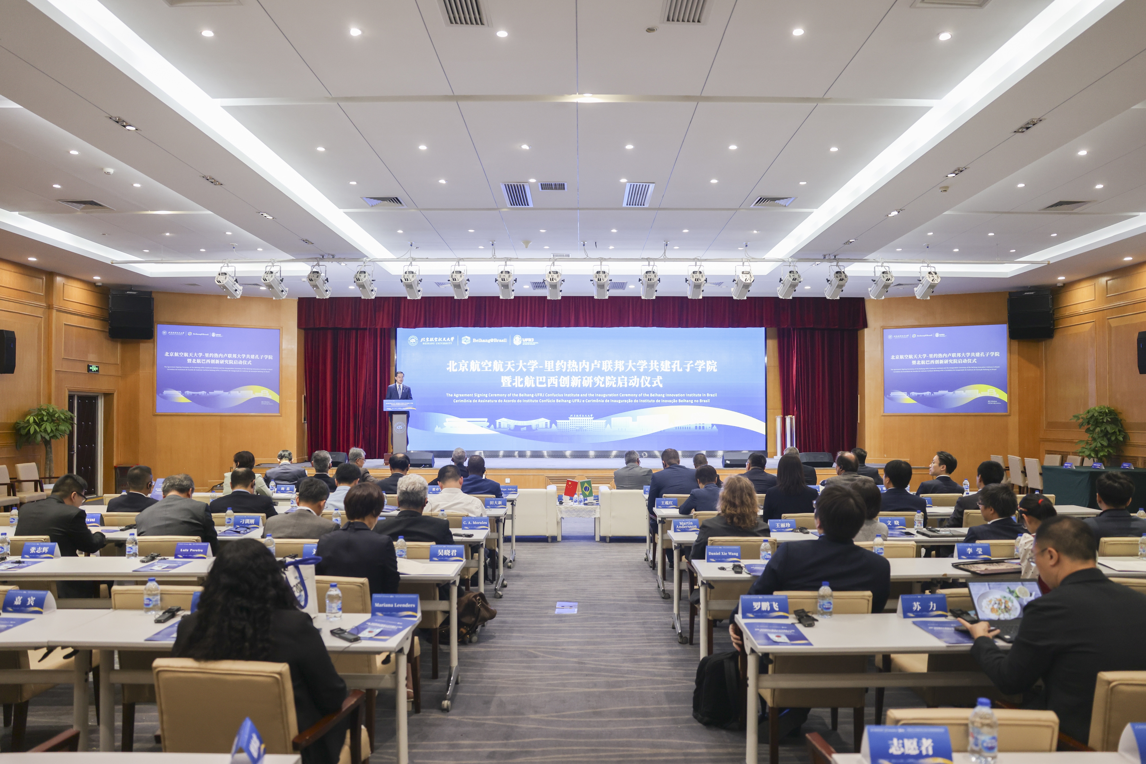 北航新闻网5月13日电(通讯员 孙园园 时琳雅 江悦 张志辉/文 记者 冯浩/摄影)5月12日,北京航空航天大学与巴西里约热内卢联邦大学共建孔子学院暨北航巴西创新研究院启动仪式在北航如心会议中心举行,北航巴西创新研究院和北航巴西中心正式揭牌成立。