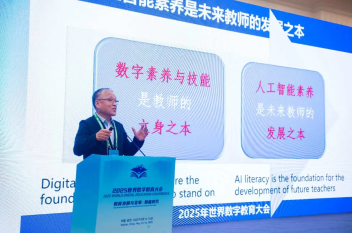 2025世界数字教育大会期间,北京航空航天大学教授、国家教材重点研究基地(中小学信息科技)主任熊璋以《人工智能素养是未来教师的发展之本》为题,在“智能时代教师角色转变与能力提升”平行会议上发言。他从智能时代的教育变革入手,从角色定位、师生协同、社会责任等方面介绍了智能时代未来教师的特点,剖析教师应具备的人工智能素养,指出智能时代的未来教师要成为合格的教师,必须实现从数字素养与技能到人工智能素养的提升。