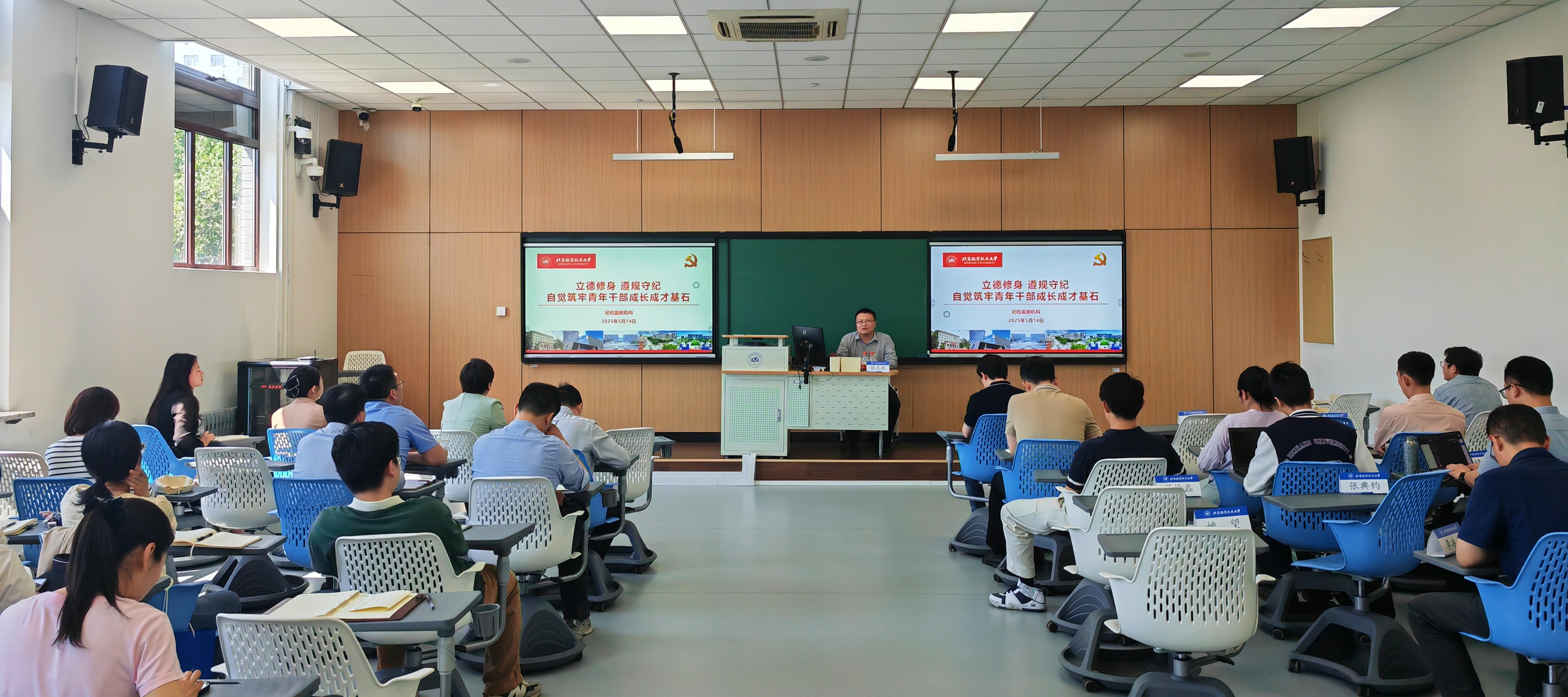 北航新闻网5月19日电(通讯员 时敬霞/文 张庚/摄影)在全党开展深入贯彻中央八项规定精神学习教育之际,5月14日下午,我校纪委副书记张志刚为第2期教师青年马克思主义者培养工程培训班学员及人力资源部/党委教师工作部/党委人才工作办公室全体职工作专题讲座,讲座由人力资源部/党委教师工作部部长、党委人才工作办公室主任鲍蕊主持。