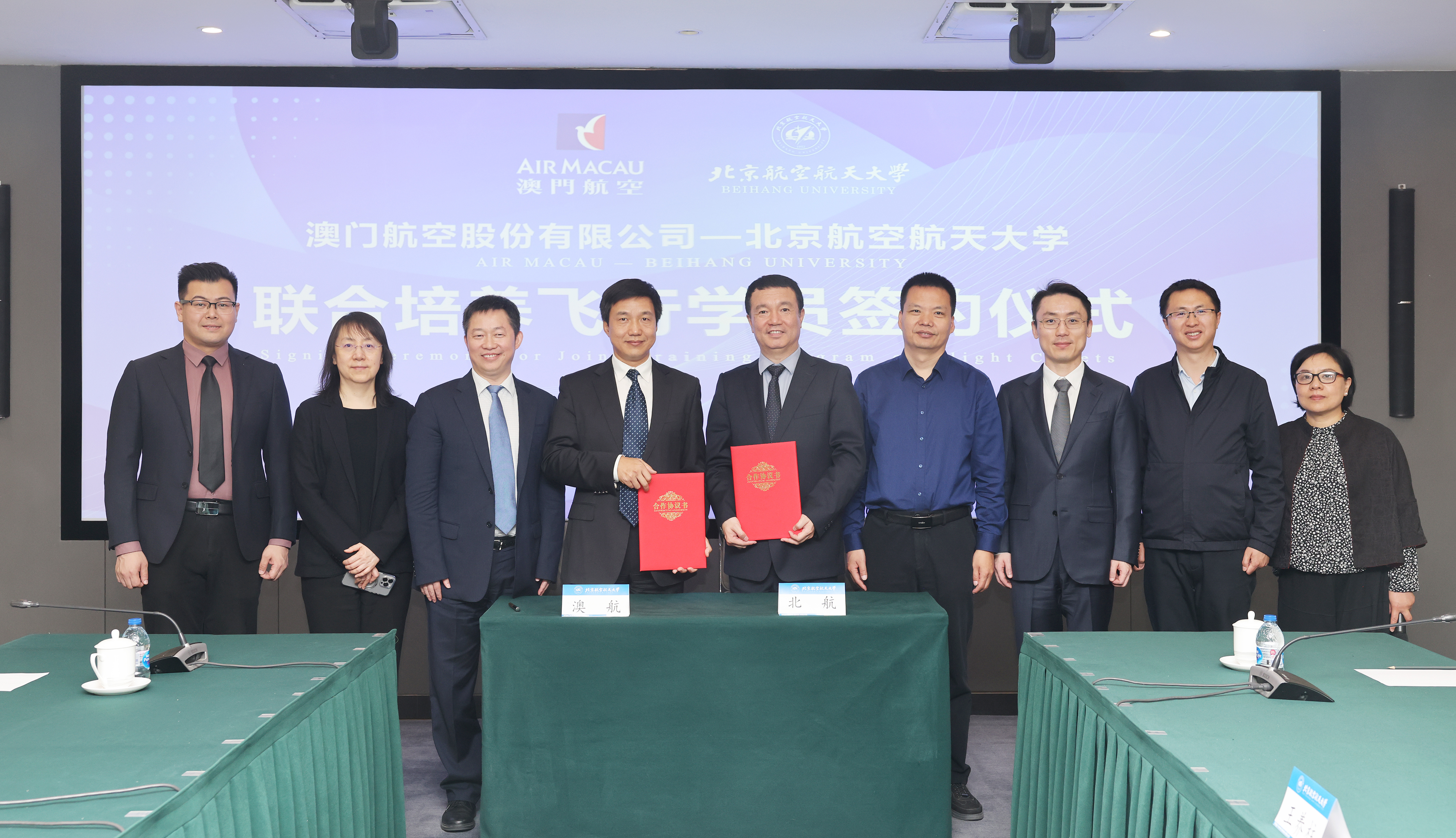 在如心会议中心中报告厅,北航与澳门航空股份有限公司举行合作协议签约仪式。澳门航空副总经理杜国富、运控中心总监李广、华北区总经理李华、人力资源部副总经理张斌,北航教务部部长钱政、国际交流合作部部长白琳、北航学院院长刘虎、飞行学院党委书记赵颖、院长王养柱,部分师生代表参加签约仪式。仪式由赵颖主持。