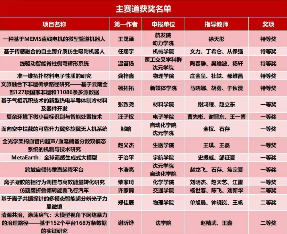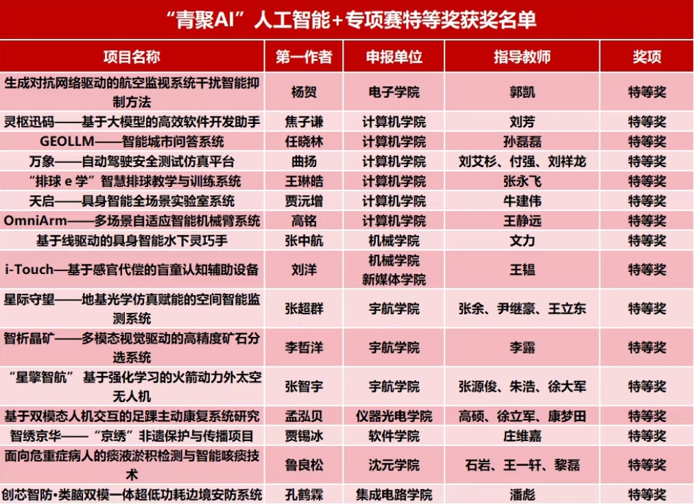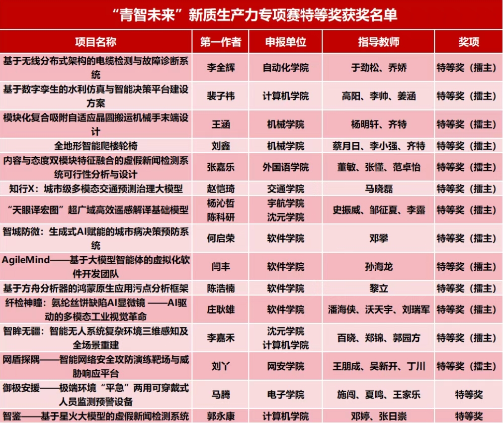 “揭榜挂帅”专项赛北京市共60项命题,北航学子摘得19项擂主、8项特等奖、15项一等奖、11项二等奖、17项三等奖,擂主数量北京市第一,再创历史新高!“人工智能 ”专项赛获16项特等奖、27项一等奖、41项二等奖、43项三等奖,“人工智能 ”应用赛特等奖数为北京高校最多!本届比赛我校获奖共计212项,1104名同学、368名老师获奖!学校再次捧起首都“挑战杯”最高荣誉,自2019年起实现首都“挑战杯”七连冠。