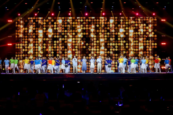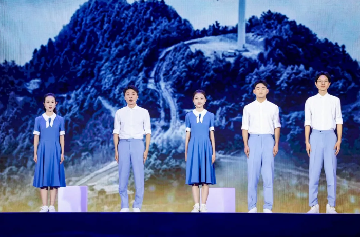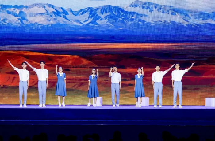 在晚会的结尾,全体演员齐聚舞台联袂演出《青春向祖国报到》,齐声朗诵,纵情高歌,是告别母校的深情回望,是奔赴四方的扬帆启航,青春报到,使命必达,不负韶华,乘风破浪。