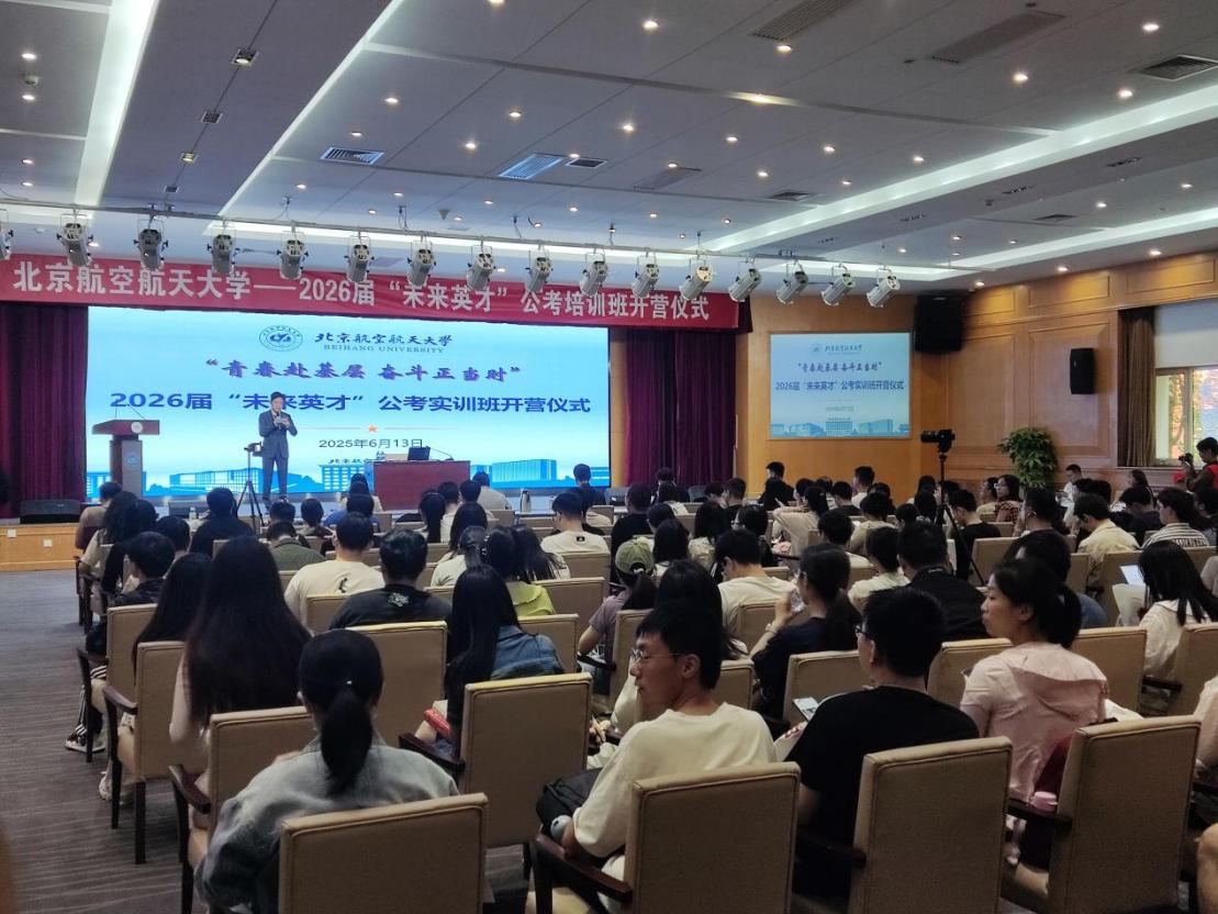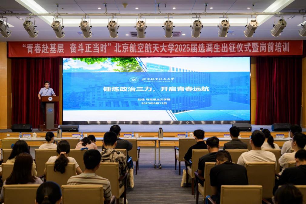 北航新闻网6月16日电(通讯员 张俊霞)6月13日,“青春赴基层 奋斗正当时”2025届选调生出征仪式暨岗前培训、2026届“未来英才”公考培训班开营仪式在如心会议中心大报告厅举行。上午9时,出征仪式在庄严的国歌声中拉开帷幕。副校长邓怡,北京市委组织部干部队伍建设规划处处长、一级调研员赵超,相关部门负责人以及2025届选调生代表出席了出征仪式。