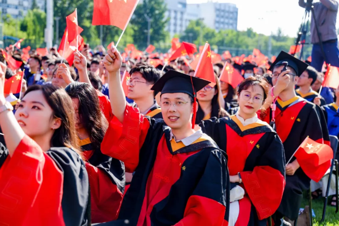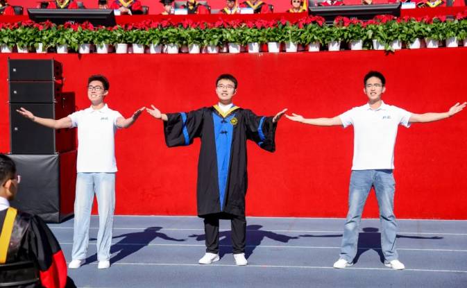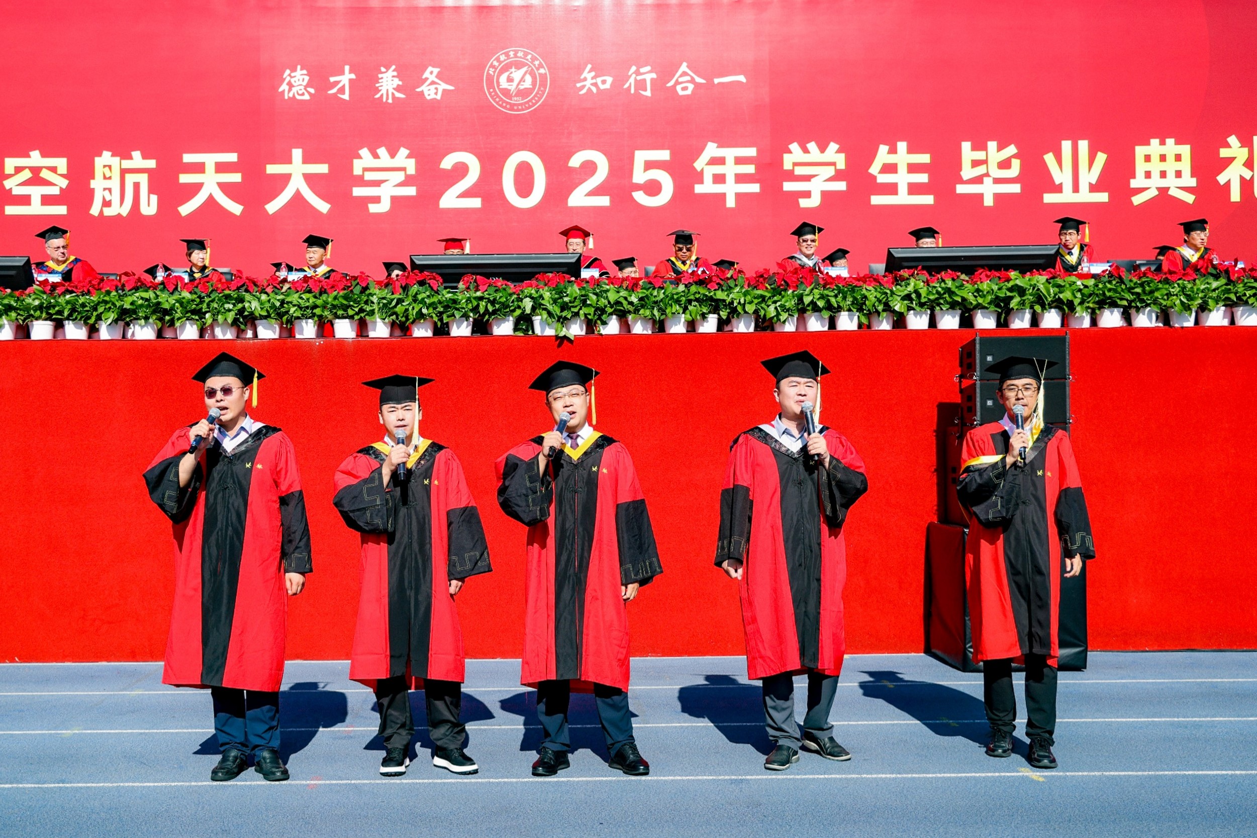 典礼最后,全体师生合唱校歌《仰望星空》,将现场的氛围推向高潮,悠扬的旋律瞬间点燃全场,汇聚成一片情感的海洋。歌声中,有骄傲的笑容在绽放,亦有惜别的泪光在闪烁。砥砺前行,追逐心中理想,扬帆启航,回应时代召唤,母校的目光,将永远为北航人点亮前行的灯塔。