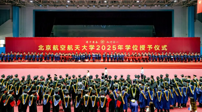 典礼结束后,在体育馆内举行了2025届学位授予仪式。在熟悉的校歌旋律萦绕下,校院领导为毕业生们一一拨穗正冠,授予象征学识与责任的学位证书。愿每一位即将展翅的北航学子,赓续以“空天报国”为内核的北航精神,汲取团结奋进伟力,胸怀家国社会天下,勇担复兴伟业重任。祝2025届卓越的毕业生们前程似锦,未来可期。