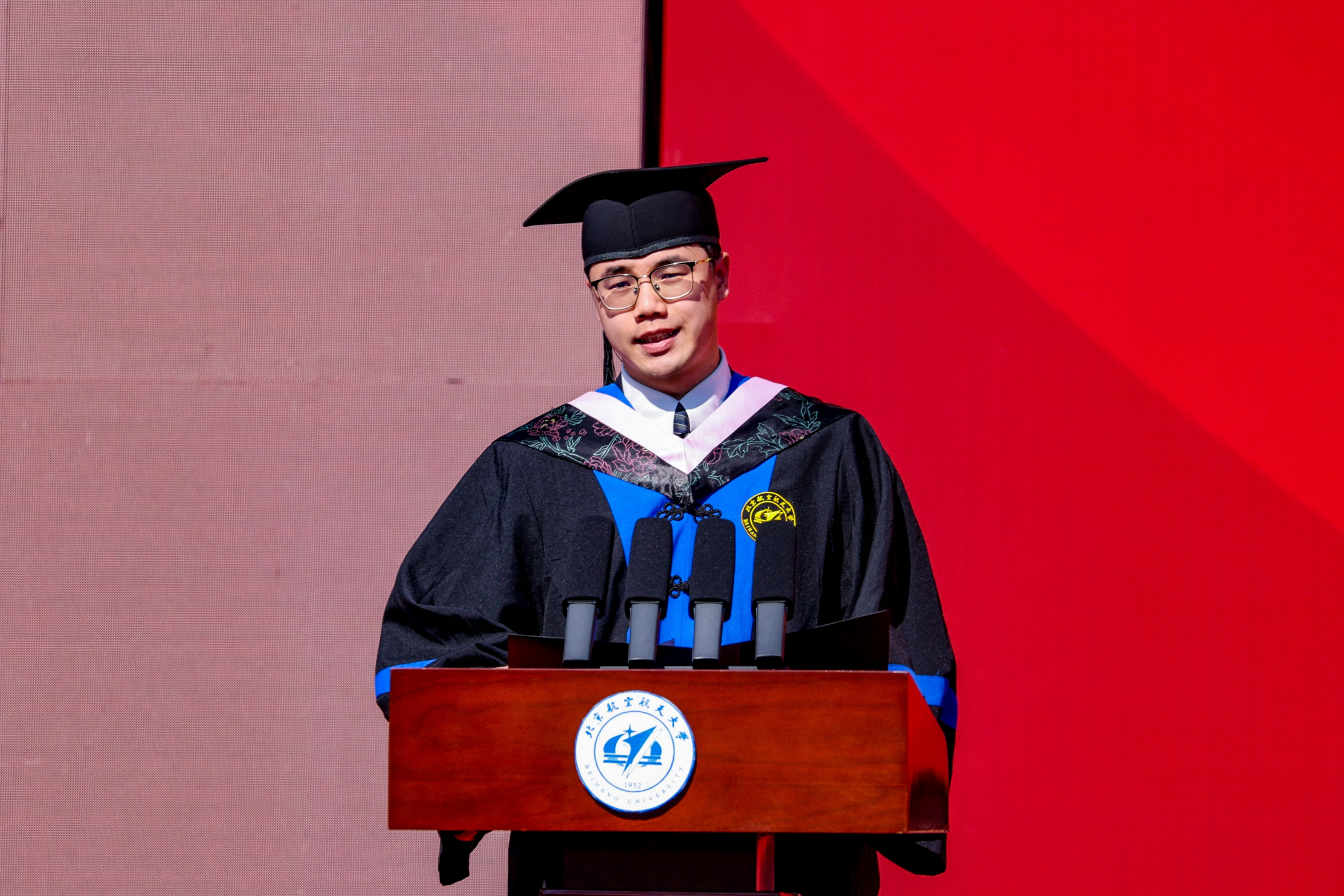 本科生毕业生代表、法学院王桢元同学在发言中表达了对母校学习和生活的眷恋与不舍,以及对母校的感激之情。他表示,回首在北航的四年,我们磨砺了开拓进取、敢为人先的勇气,收获了拼搏与共、微光成炬的情谊,锻造了淬火铸魂、挺膺担当的脊梁,他号召同学们用实际行动诠释北航青年的责任担当。