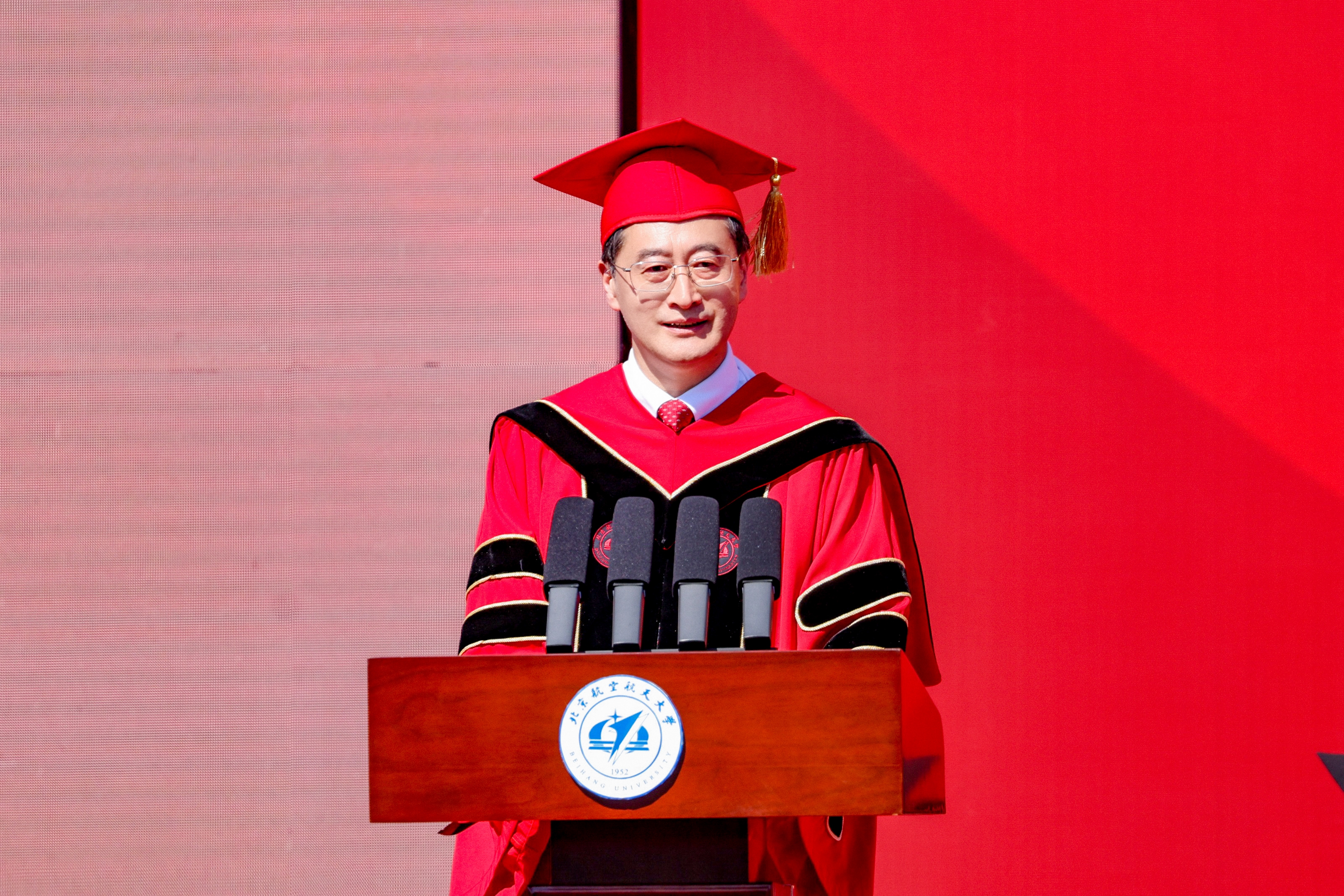 在热烈的掌声中,王云鹏发表了热情洋溢的讲话。他饱含深情地回顾了学子们与国家同频、与时代共振的青春使命担当,充分肯定了学子们在各专业领域的突出成绩,“回望你们在北航的成长足迹,有矢志攻关科研难题的担当,有扎根边陲服务人民的坚韧,更有文明对话中传递中国声音的自信,每个人都收获了属于自己的青春印记”。围绕人工智能时代的发展机遇与挑战,王云鹏寄语全体2025届毕业生,为青年学子指明方向。一是正确认识“恒与变”。既要秉持“穷则变,变则通”的开放包容之心,日新不辍、与时俱进,在变化中汲取改造世界的力量,更需坚守“变中求定”的初心使命,以“国之大者”的执着笃定,渲染技术狂飙时代的精神底色。二是精准理解“道与术”。“道”是人类独有的创造力、价值判断和伦理思考的统称,“术”是人类对技术进步和工具创新的精准驾驭,既要善用技术创新这一“术”,更要坚守价值思考这一“道”,培养独立思考和质疑的能力,用思想为技术指明方向,让技术为思想插上翅膀,实现“道术相济”的永恒价值,达到“君子役物,不为物役”的理想境界。