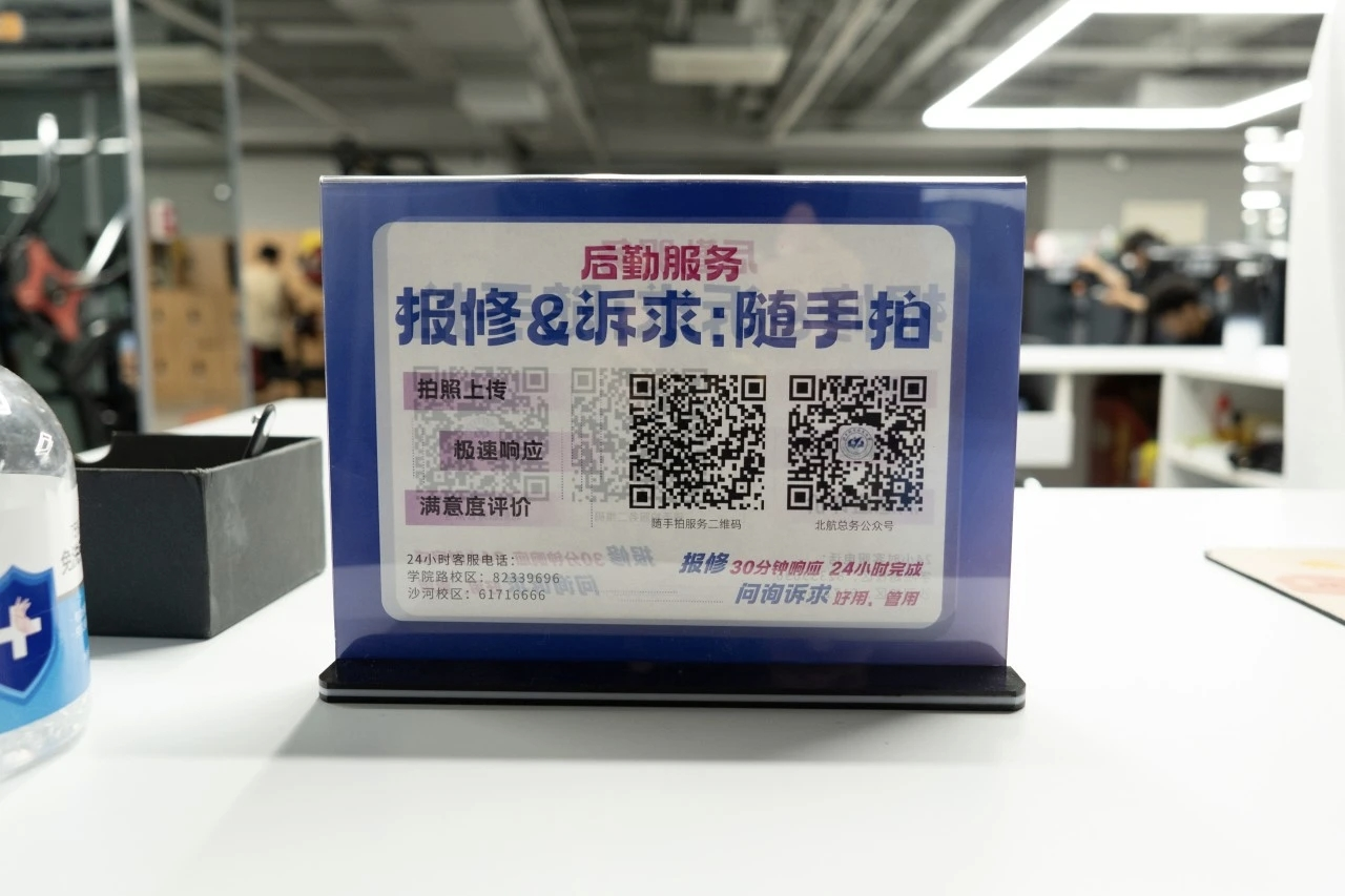 今年3月,自学习教育开展以来,总务部总结分析近一年的服务数据,结合师生畅通意见收集渠道的呼声,推出了升级版“随手拍 ”。在两校区教室、卫生间、电梯、场馆、超市等重点服务区域张贴专用二维码,新增问询、诉求功能,建立结合服务场景的诉求反馈体系,48小时响应闭环,将服务触角精准延伸至师生每一处所需。