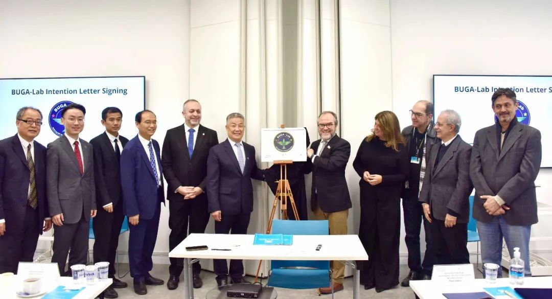 赵长禄与罗伯托·梅德罗尼奥签署共建北航巴西创新研究院谅解备忘录,与会嘉宾为孔子学院、创新研究院、中国-巴西文明交流互鉴合作研究中心揭牌。