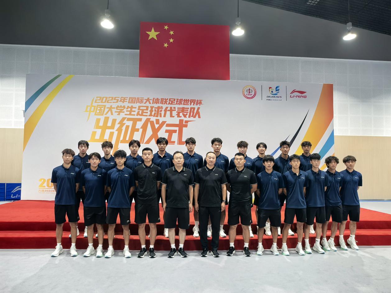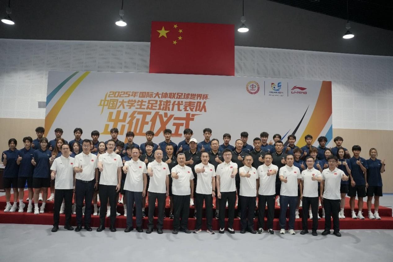 北航新闻网8月30日电(通讯员 高胜杰)8月29日,2025年国际大体联足球世界杯中国代表队出征仪式在北京李宁中心举行。教育部学生体育联合会、大连市政府、李宁公司及四所参赛高校代表队齐聚一堂,为即将赴大连参赛的中国大学生代表队壮行。北京航空航天大学高水平男足凭借2024年全国青少年校园足球联赛大学男子甲组冠军,以及第二届亚洲大体联足球亚洲杯季军的优异战绩,从全国高校脱颖而出,赢得了本次世界杯入场券。