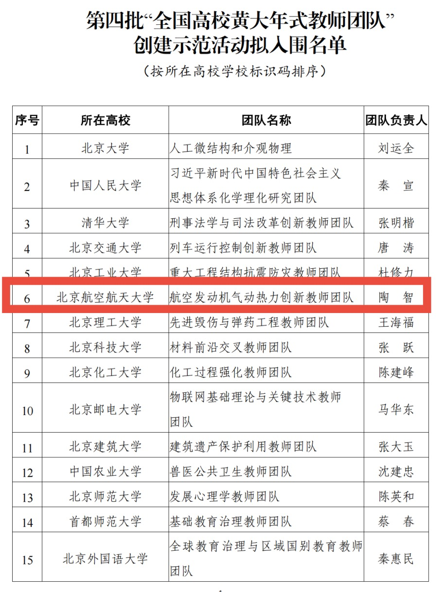 北航新闻网9月5日电(航宣)日前,教育部印发通知公布第四批“全国高校黄大年式教师团队”创建示范活动入围名单,由北京航空航天大学陶智院士领衔的航空发动机气动热力创新教师团队入选。