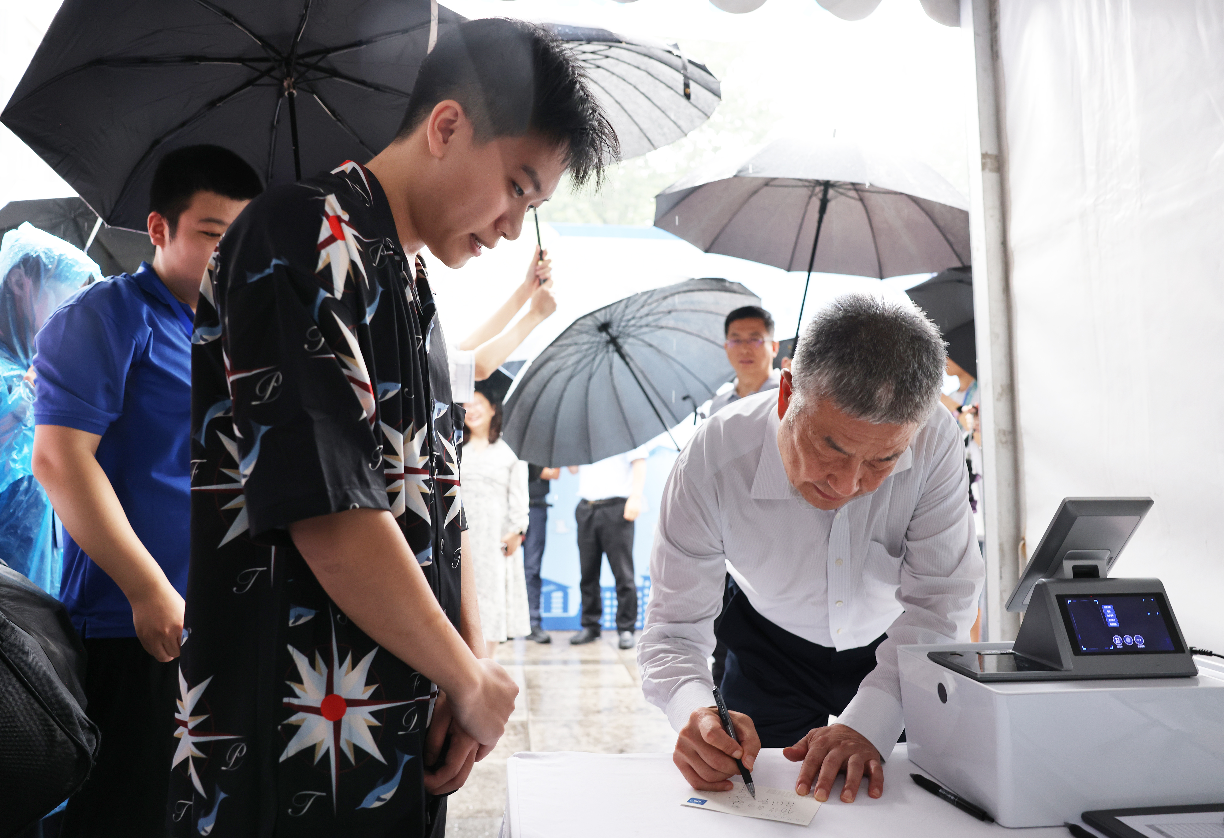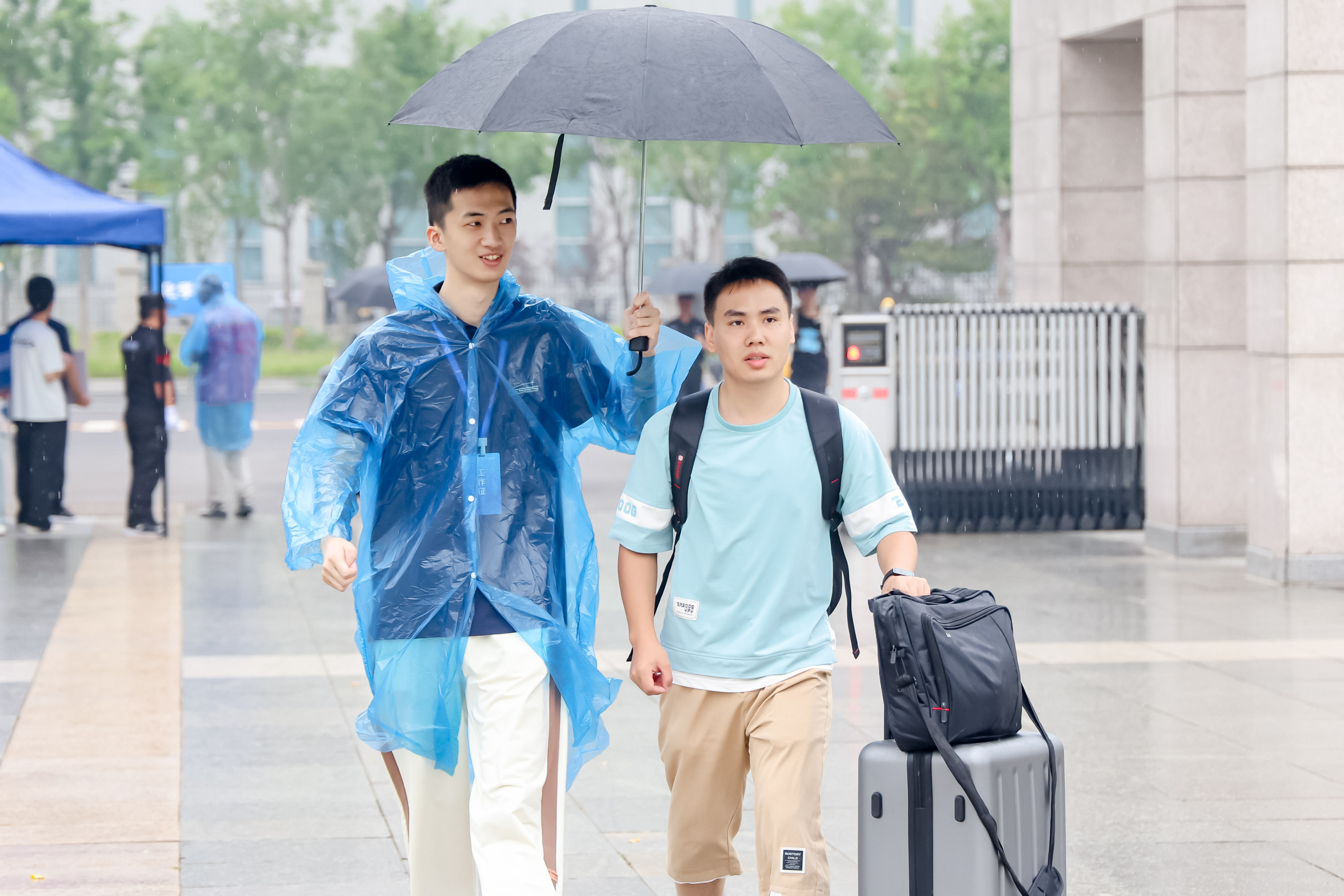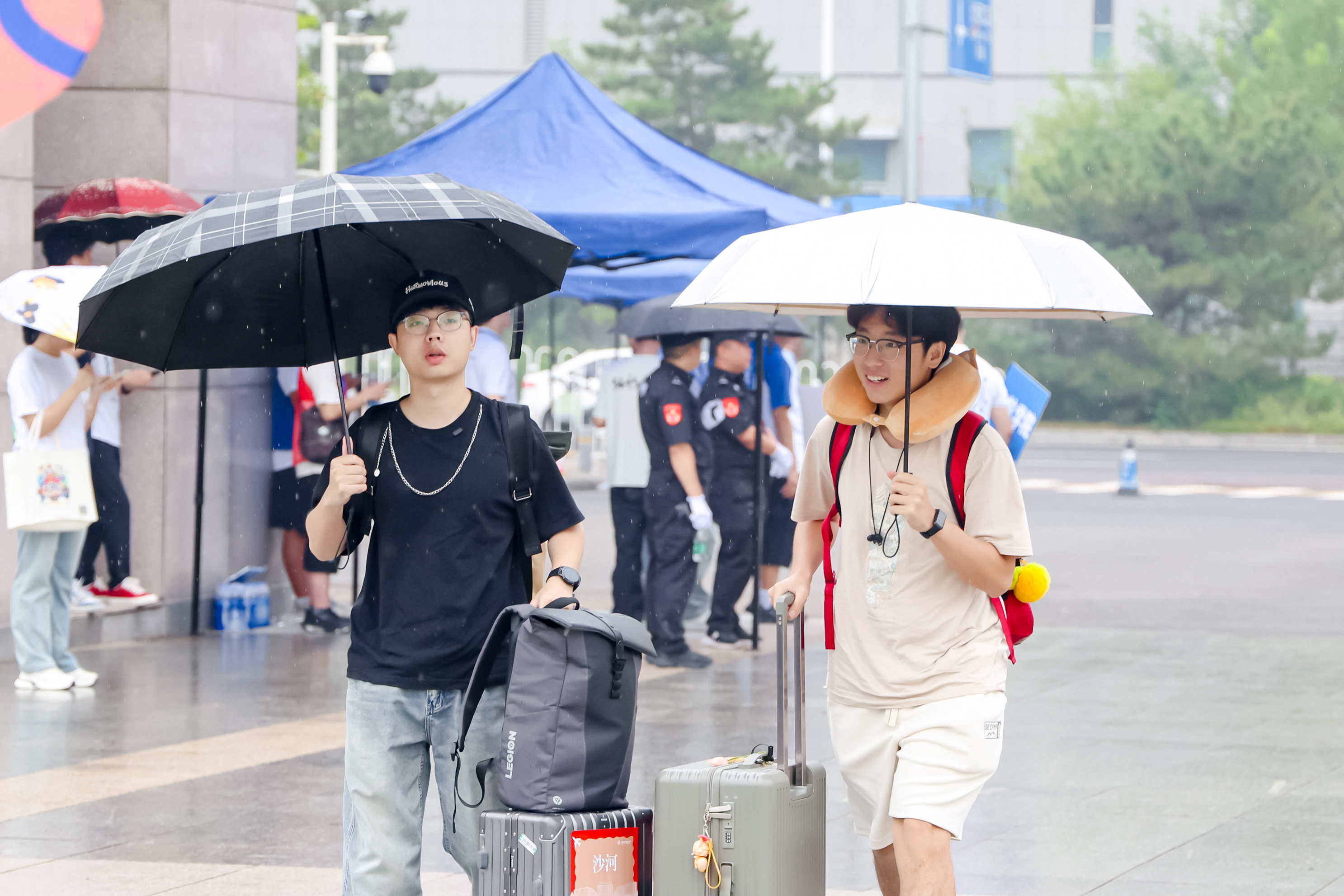 上午,迎新进程过半,一场喜雨降临,雨中报到依然有序,各项服务热情不减。