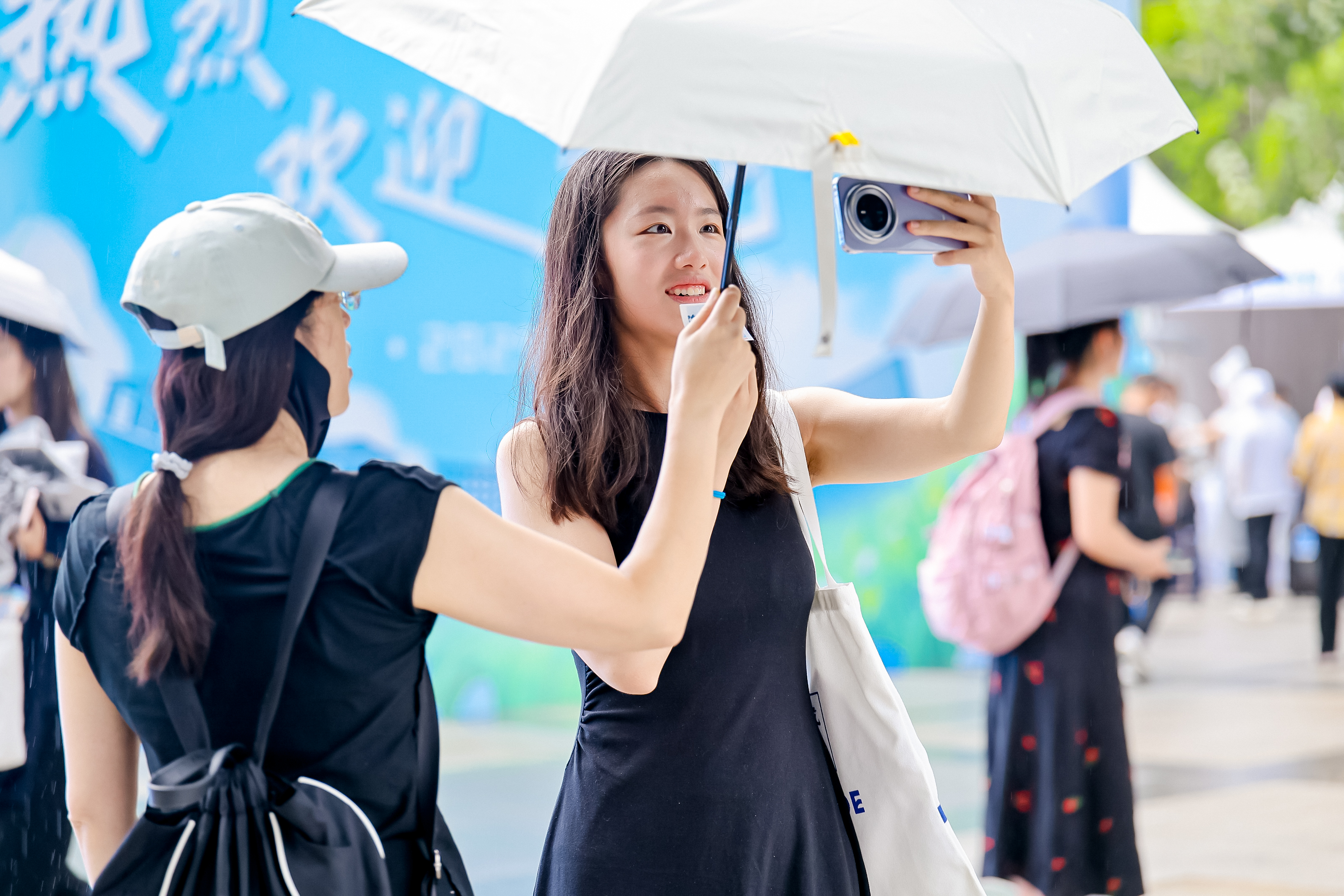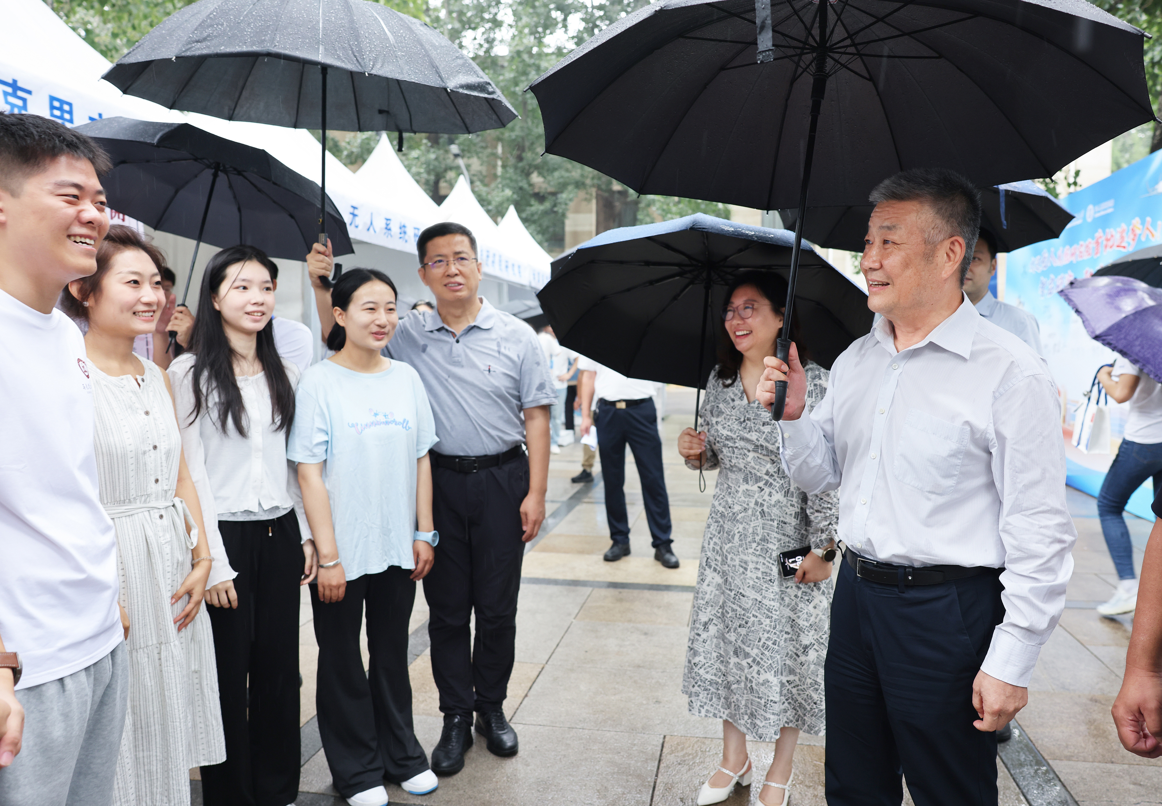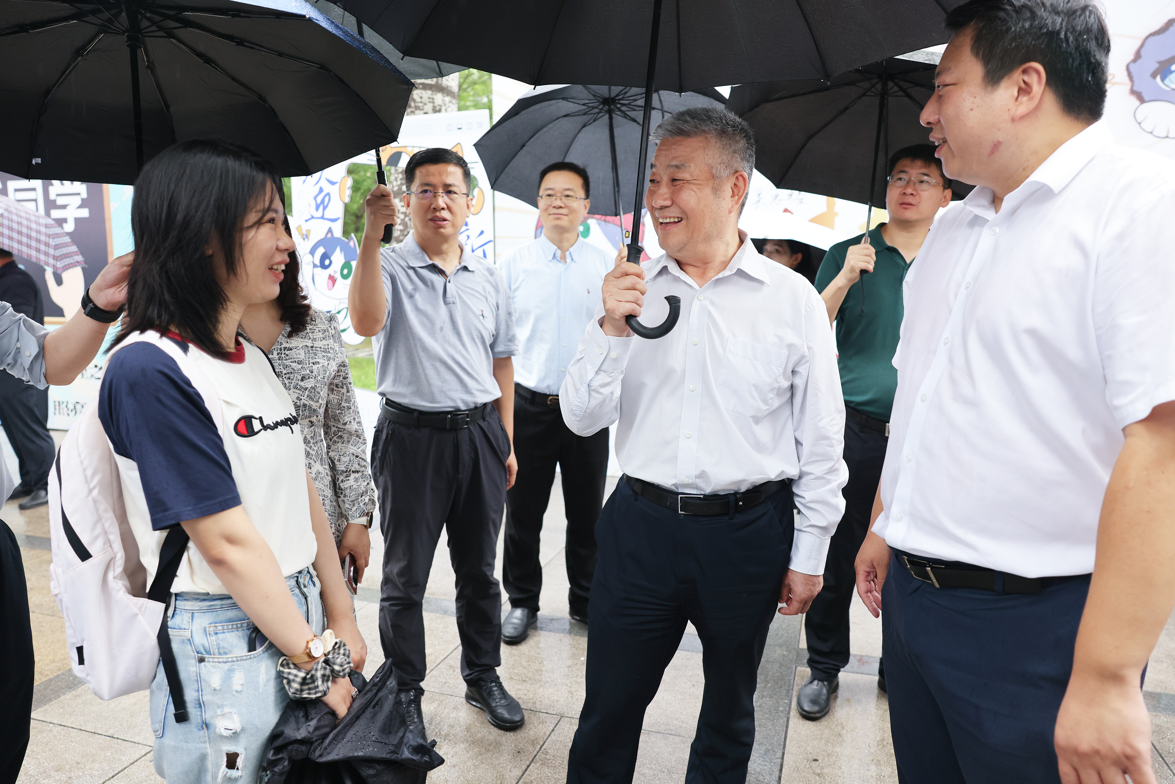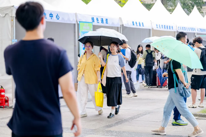 上午,迎新进程过半,一场喜雨降临,雨中报到依然有序,各项服务热情不减。