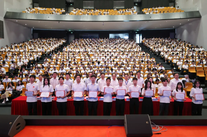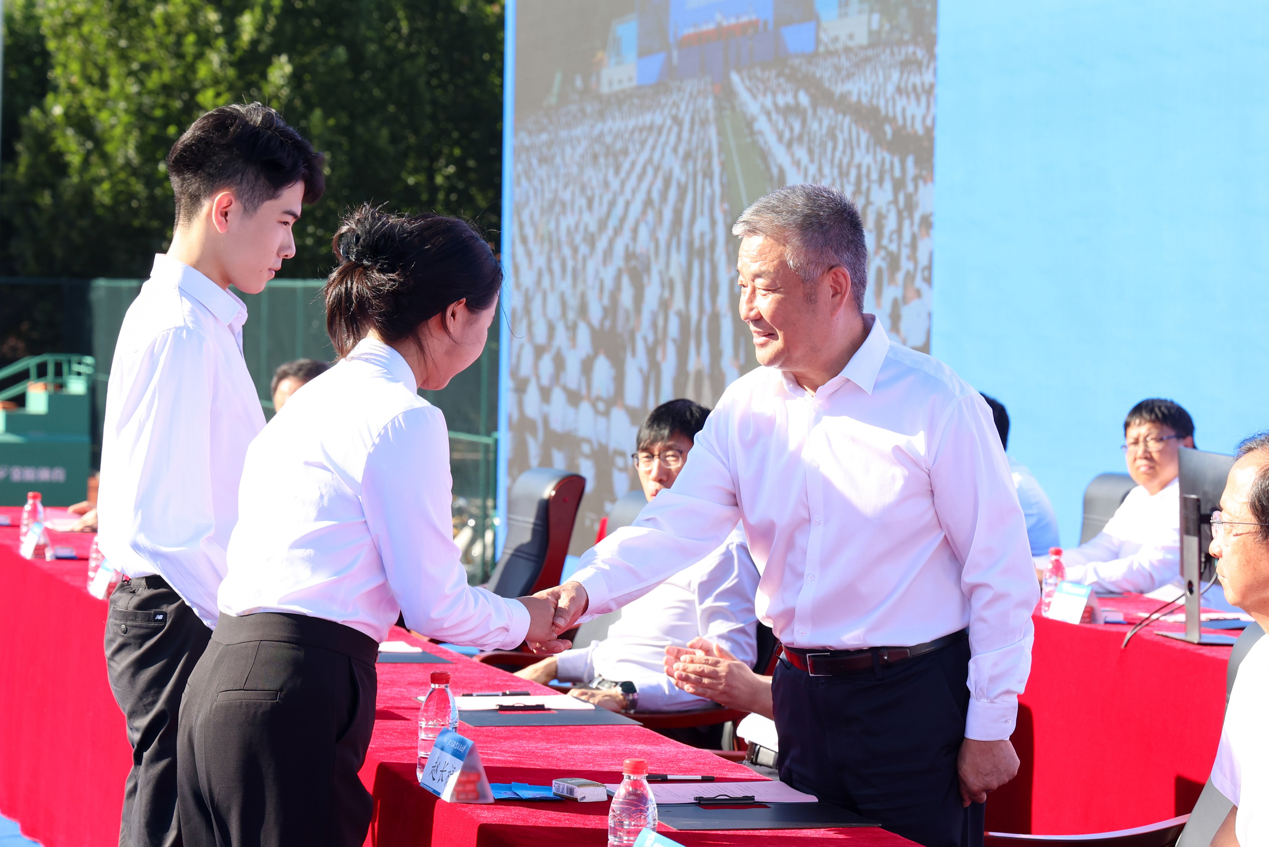 典礼上,赵长禄为新生代表授予校徽。两地三校园2025级新生齐将校徽佩戴在胸前,带着自豪感和责任感,成为勇担使命的新北航人。