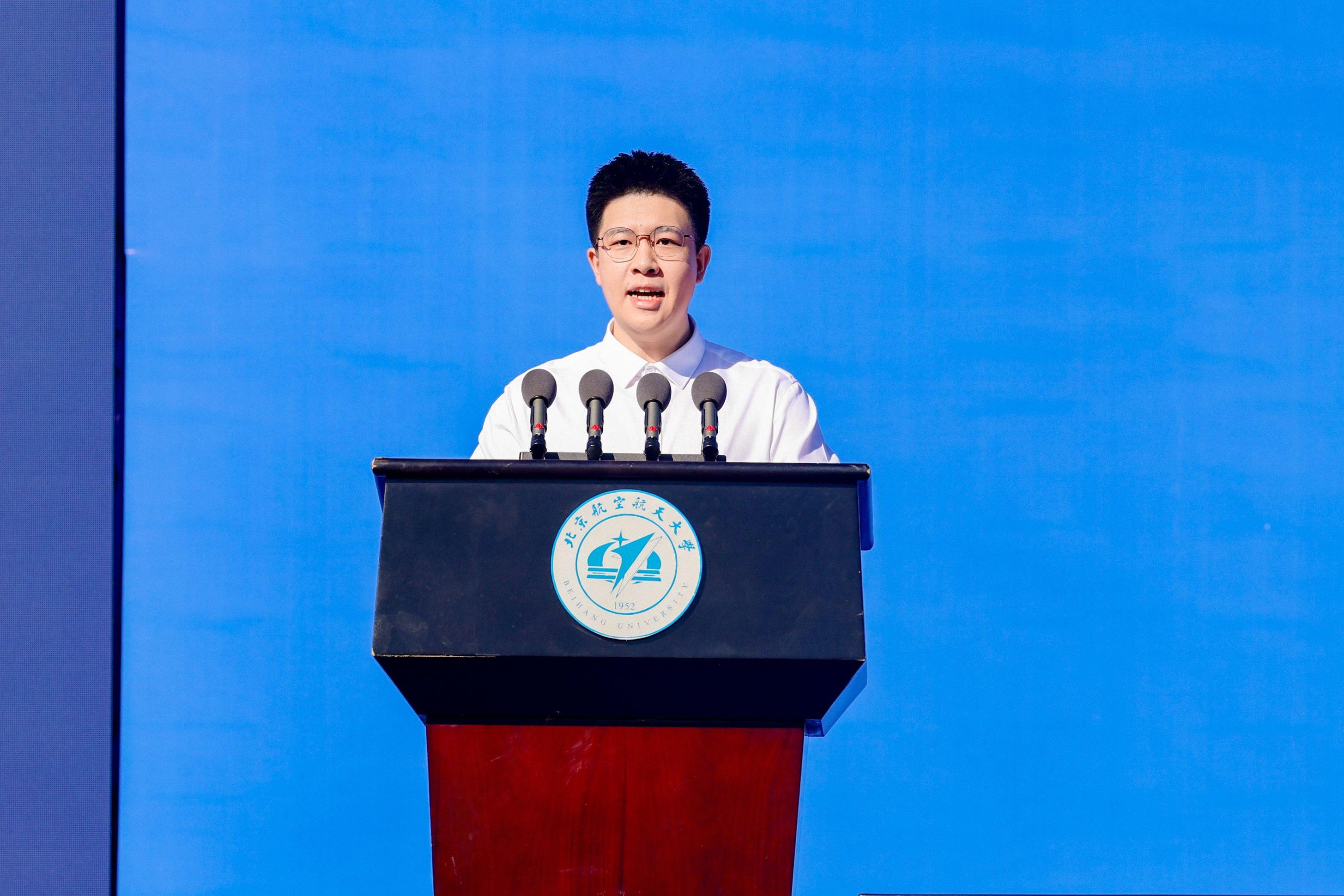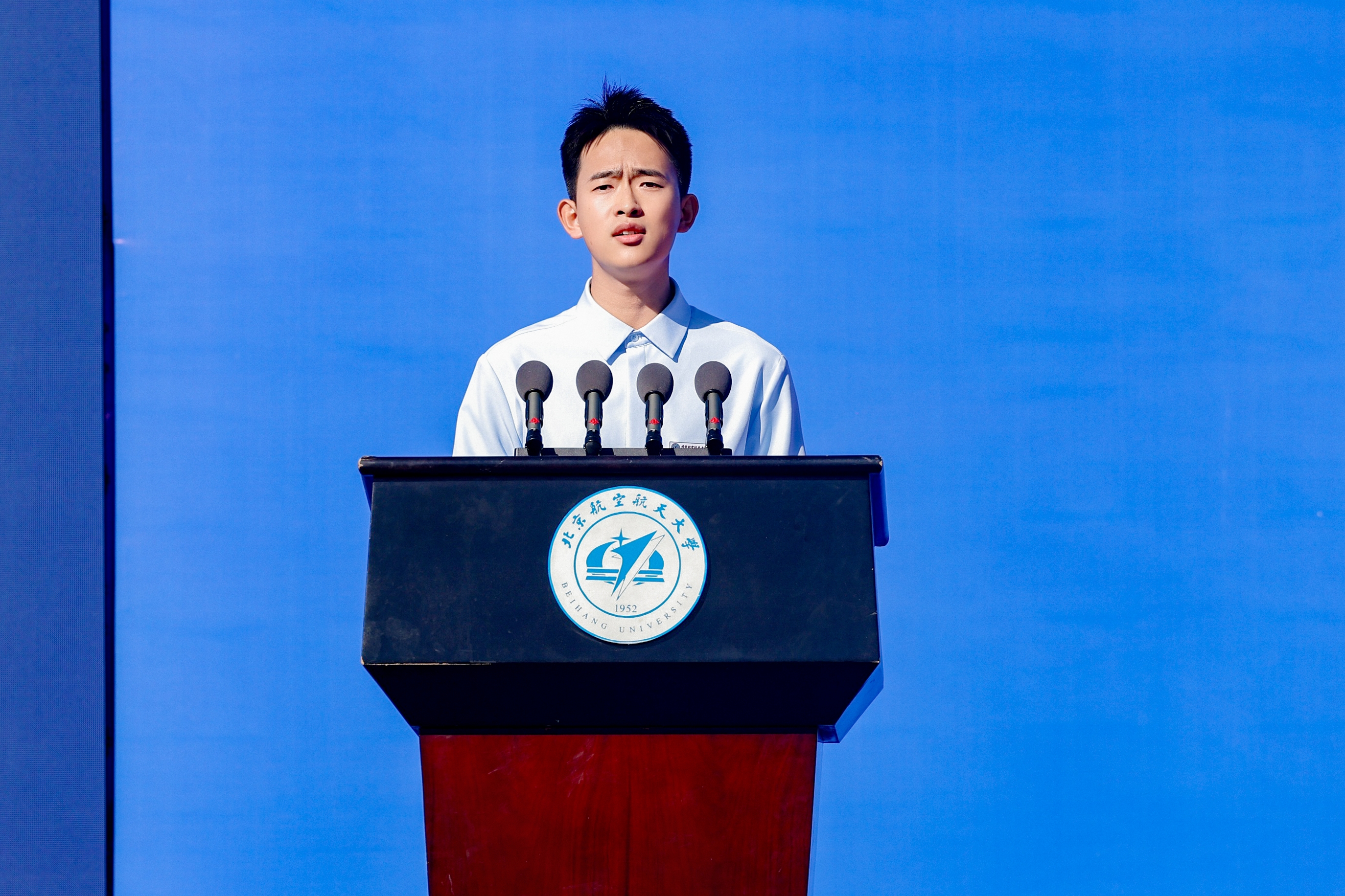 交通科学与工程学院硕士研究生孙宇轩代表全体研究生新生发言。孙宇轩分享了作为广场合唱团成员参与纪念中国人民抗日战争暨世界反法西斯战争胜利80周年大会的切身体会,表示作为新时代青年要怀揣坚定信念,铭记历史、挺膺担当、脚踏实地,将个人理想写入祖国空天事业的宏伟画卷,为强国建设作出北航贡献。