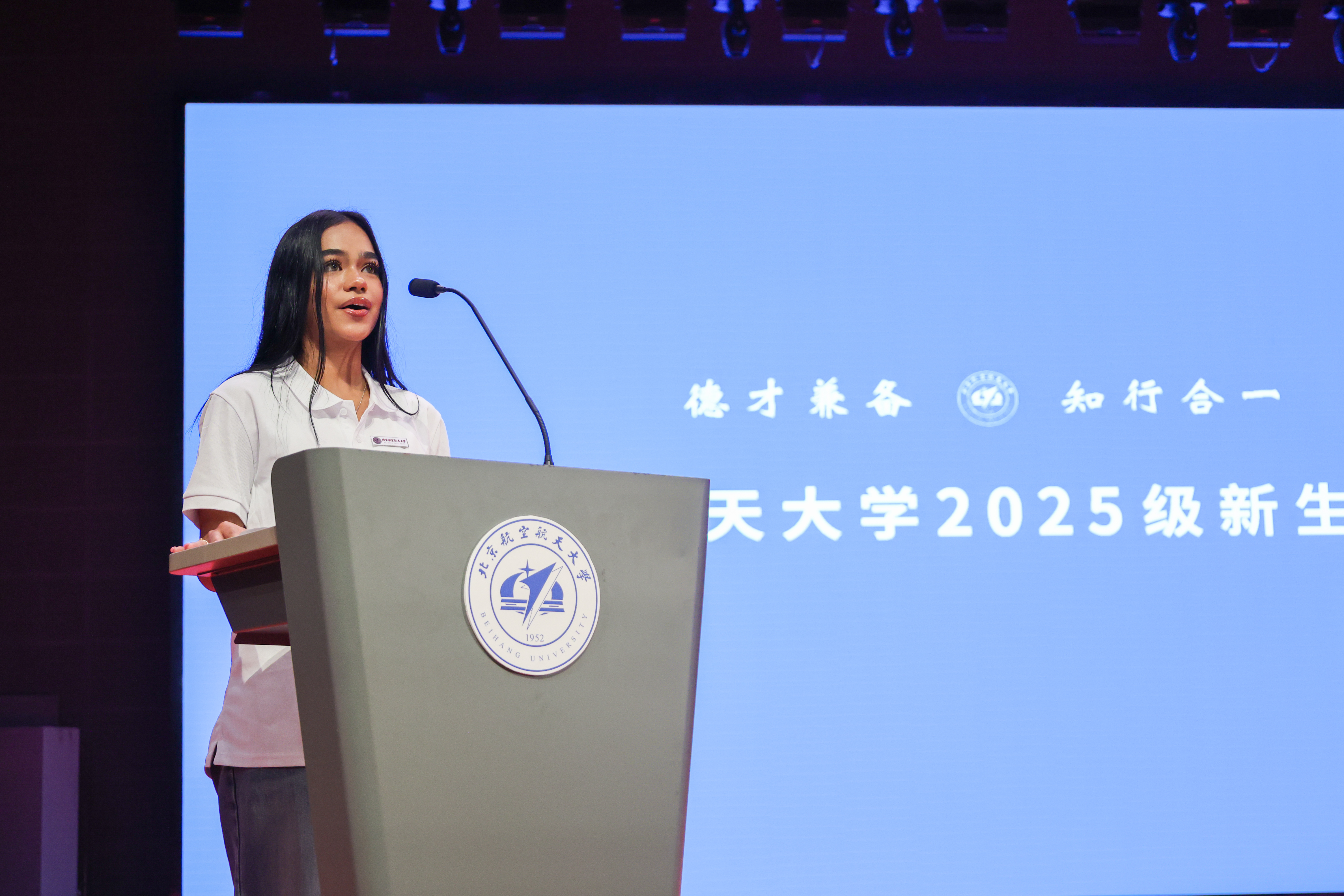 来自杭州北航国际创新研究院的新生代表丹娜・布斯塔曼特・巴拉甘(danna bustamante barragán)作为国际学生代表发言。她表示,将在北航杭州国际校园中深刻体悟北航“包容、创新、合作”的国际化愿景,保持好奇心与开放心态,直面挑战、勇敢探索、努力学习,为构建人类命运共同体注入青春力量。